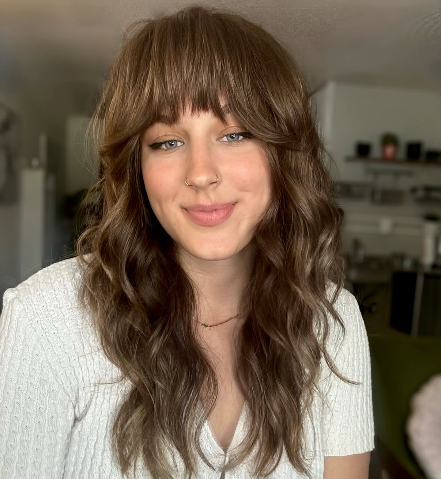 Fringe bangs are perfect for shags because by appearing thin in the front, they make the rest of the style look fuller. Take it to the next level with soft curls that really amp up the volume.