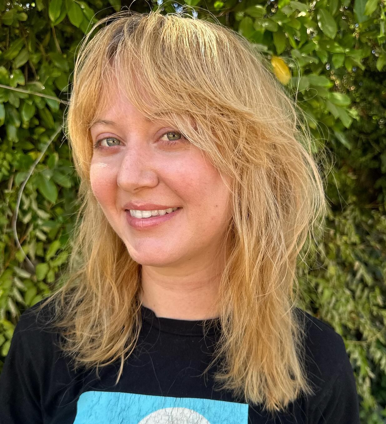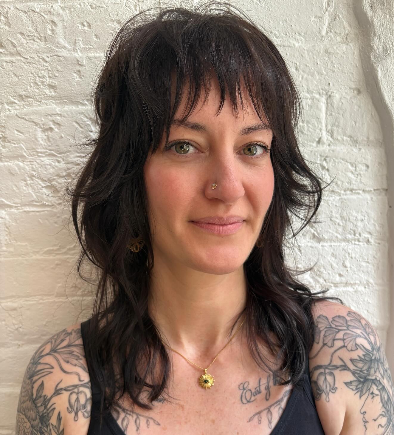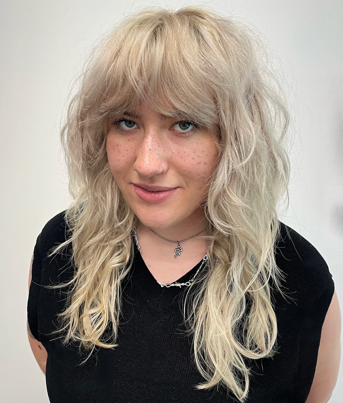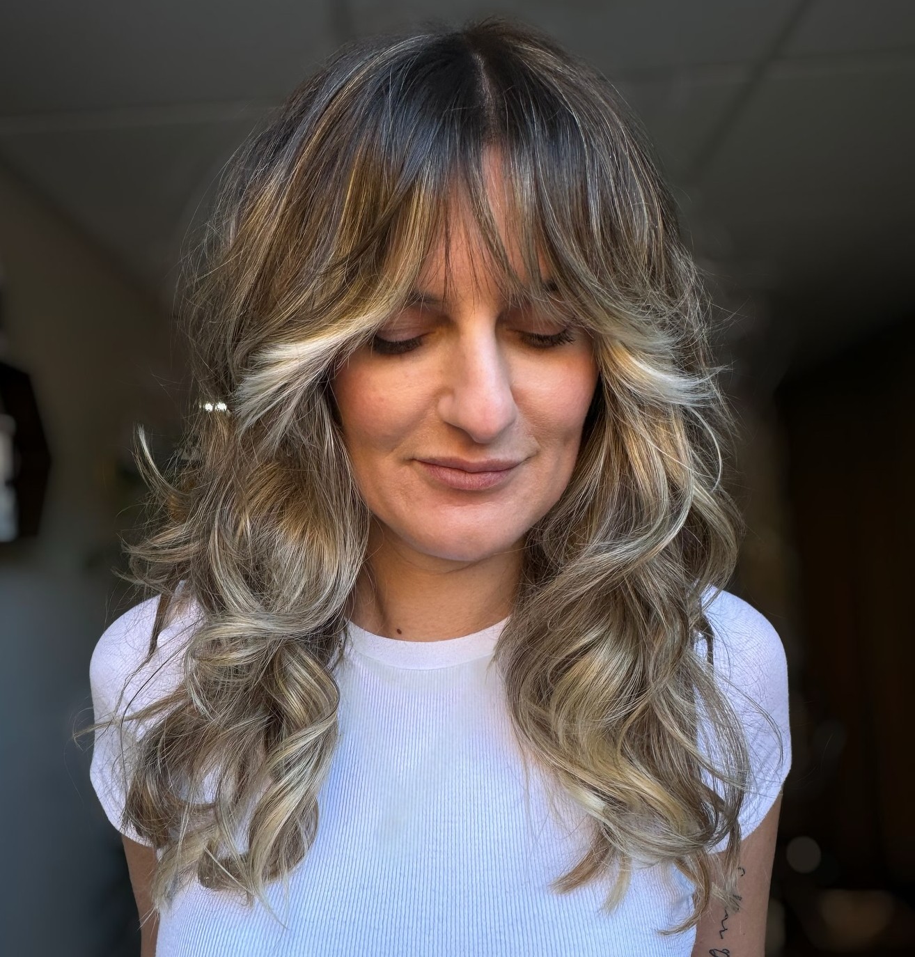 Fringe bangs are perfect for shags because by appearing thin in the front, they make the rest of the style look fuller. Take it to the next level with soft curls that really amp up the volume.
