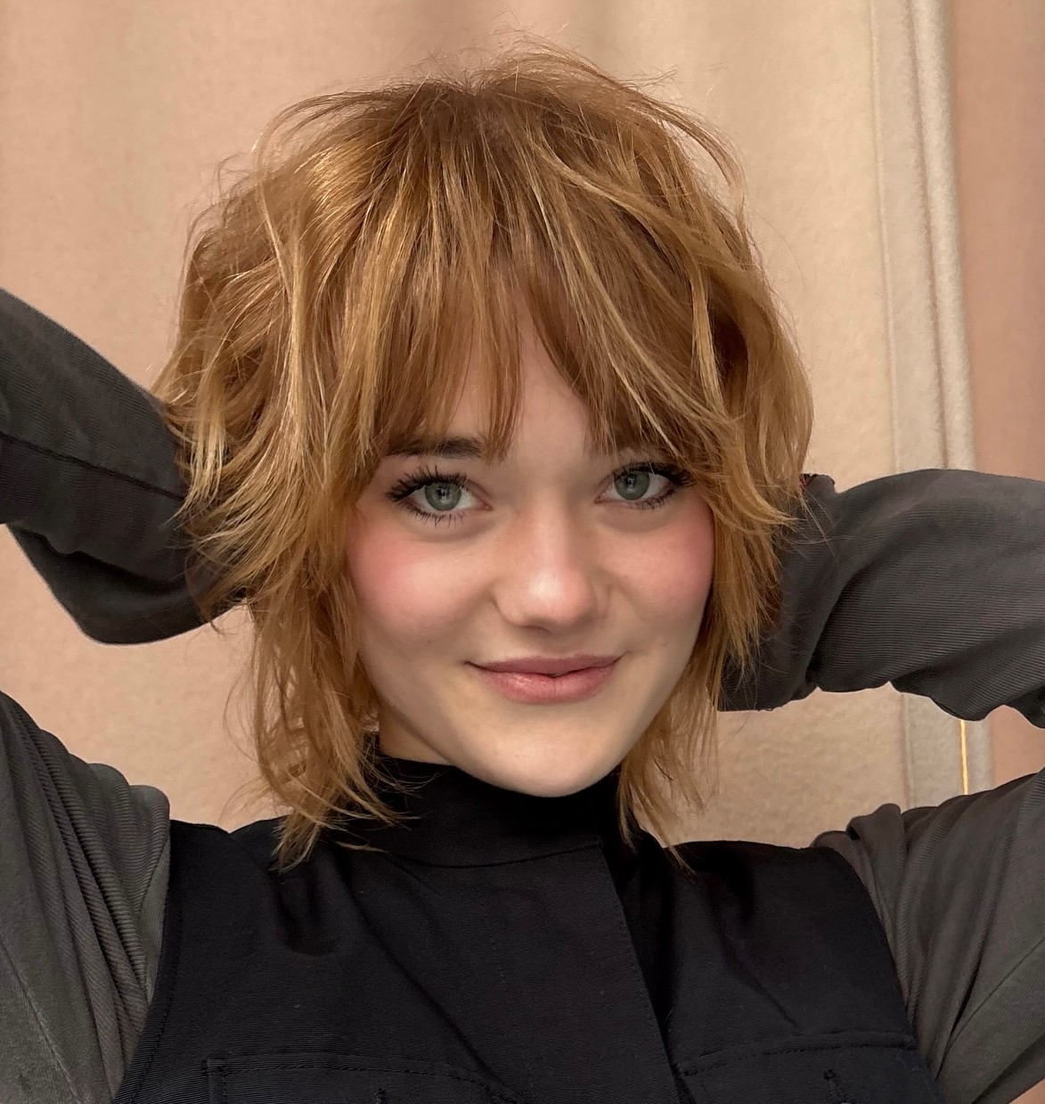 This tousled bob cut is both soft and sassy. While shaggy layers give out your rebellious nature, the choppy bangs soften facial features, making the style really cute. If you have straight hair texture, curl up your cut for a fuller look.