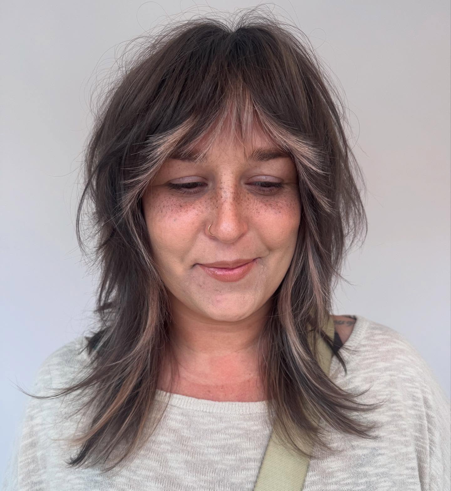 A mullet shag is considered a boyish and bold style, but this interpretation of the layered haircut looks quite feminine. Enhance your brown mane with sandy blonde highlights to bring more texture and movement to the strands.
