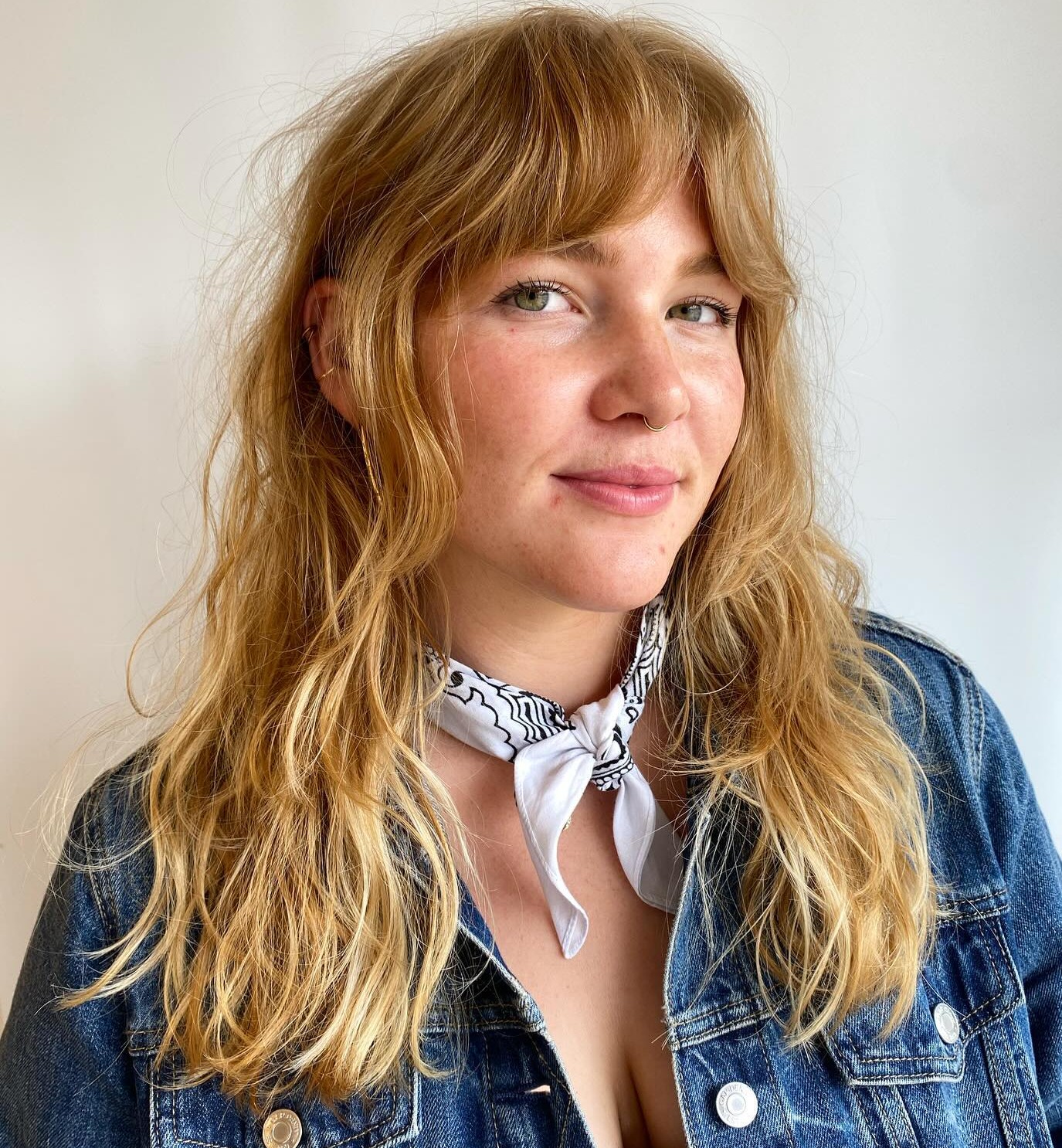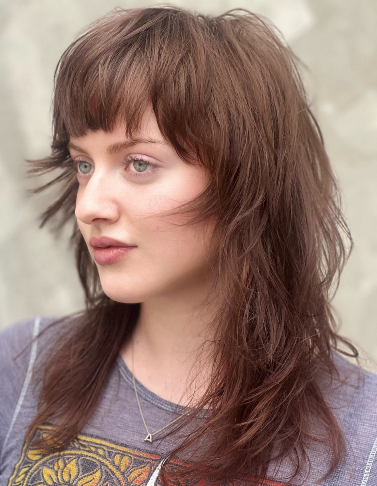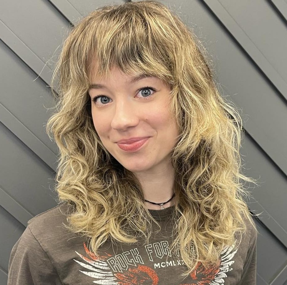 Fringe bangs are perfect for shags because by appearing thin in the front, they make the rest of the style look fuller. Take it to the next level with soft curls that really amp up the volume.