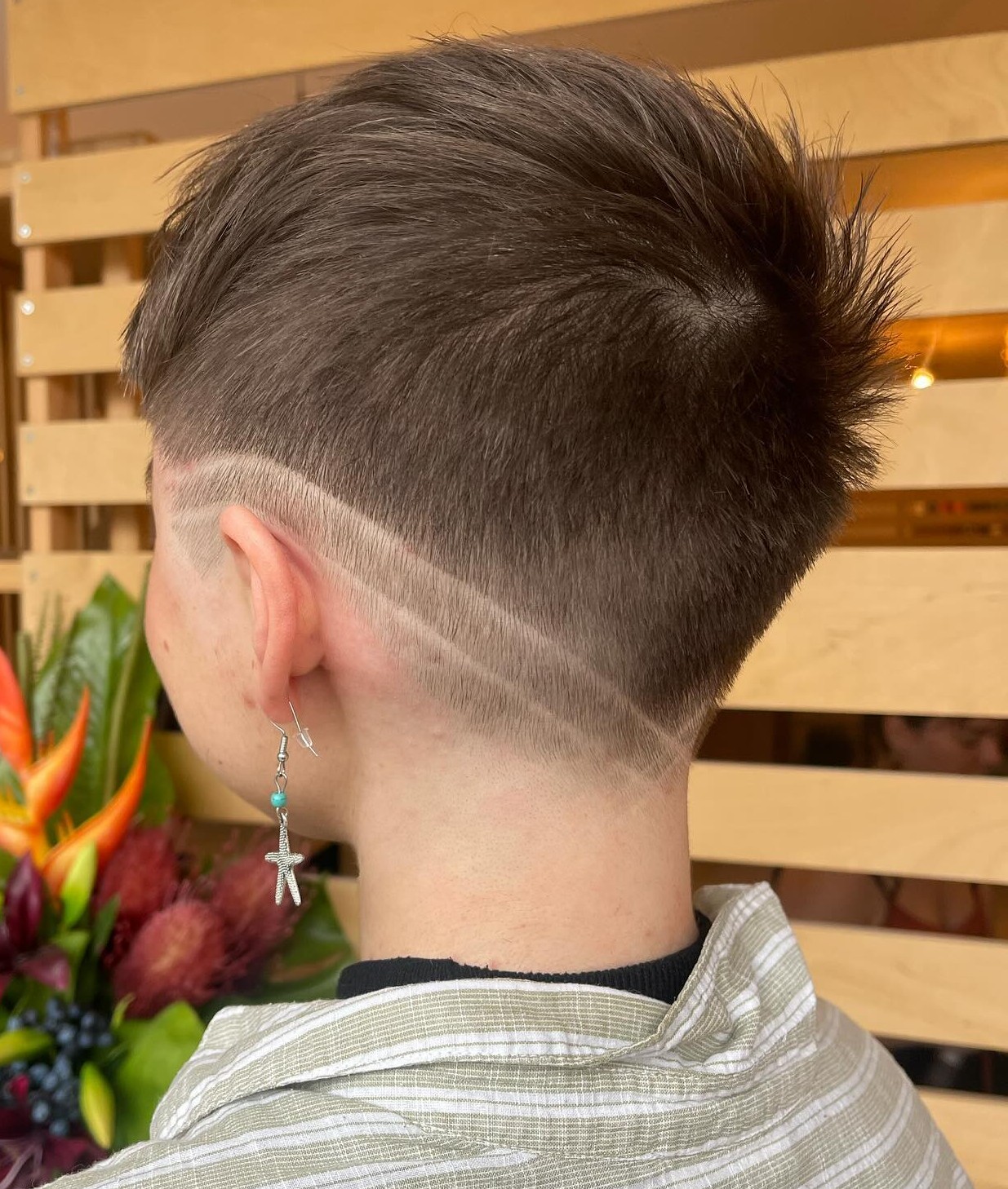Buzzing off a larger part of your hair for an undercut provides more space to play with intricate patterns like this lotus design. Complement the short-cropped section with pale pink or amber rose hair on top to harmoniously finish this floral style and showcase your creative and artistic personality.