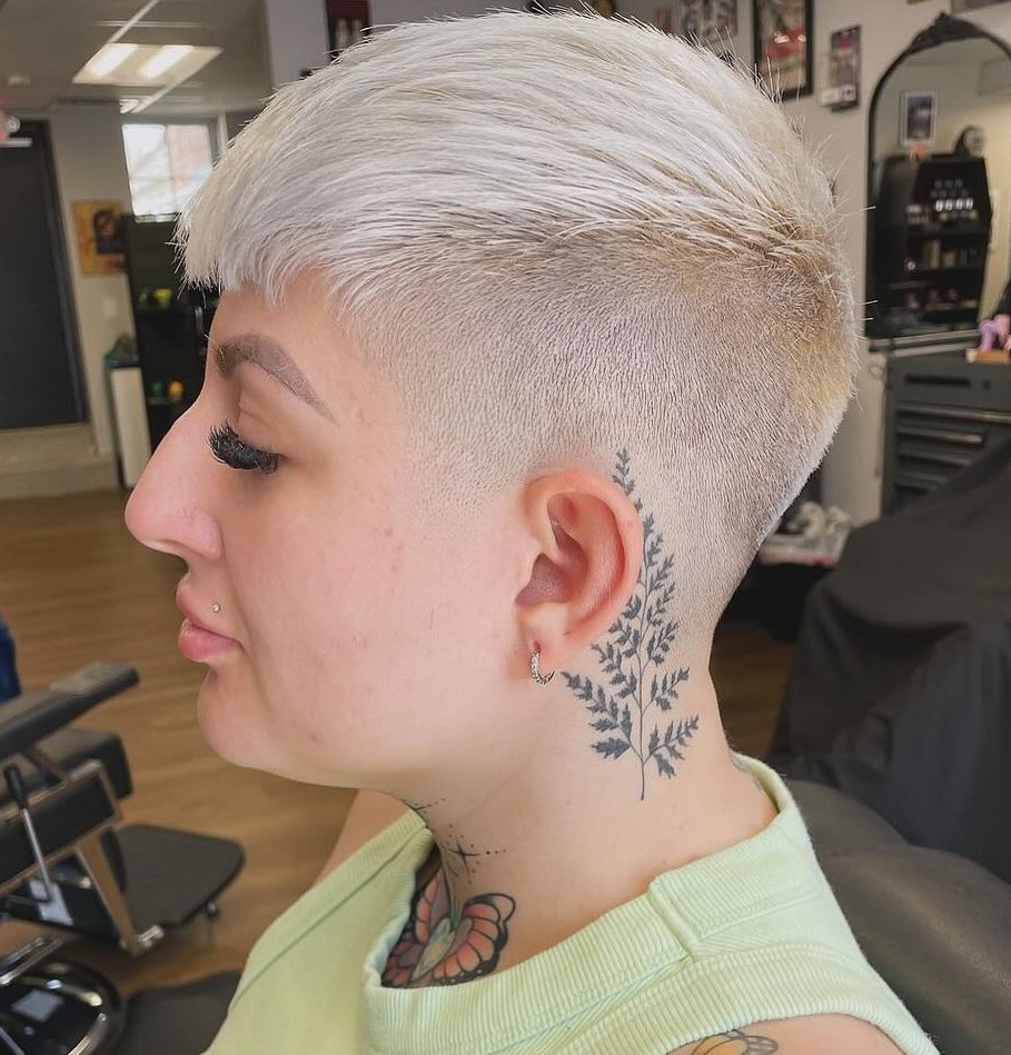 Playing with both color and cut can result in a dynamic and captivating hairstyle, allowing for a bold statement. Shave down the hair on the nape and temples to the scalp, leaving the longer strands on the crown and dyeing them white blonde.