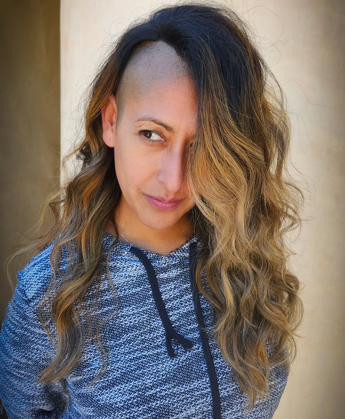 This shaved hairstyle, inspired by Kelly Osbourne and her iconic undercut style, brings out your features and creates a soft frame for your face shape. The asymmetrical look with bouncy waves for women with an independent way of thinking is colorful, flirty, and vibrant.