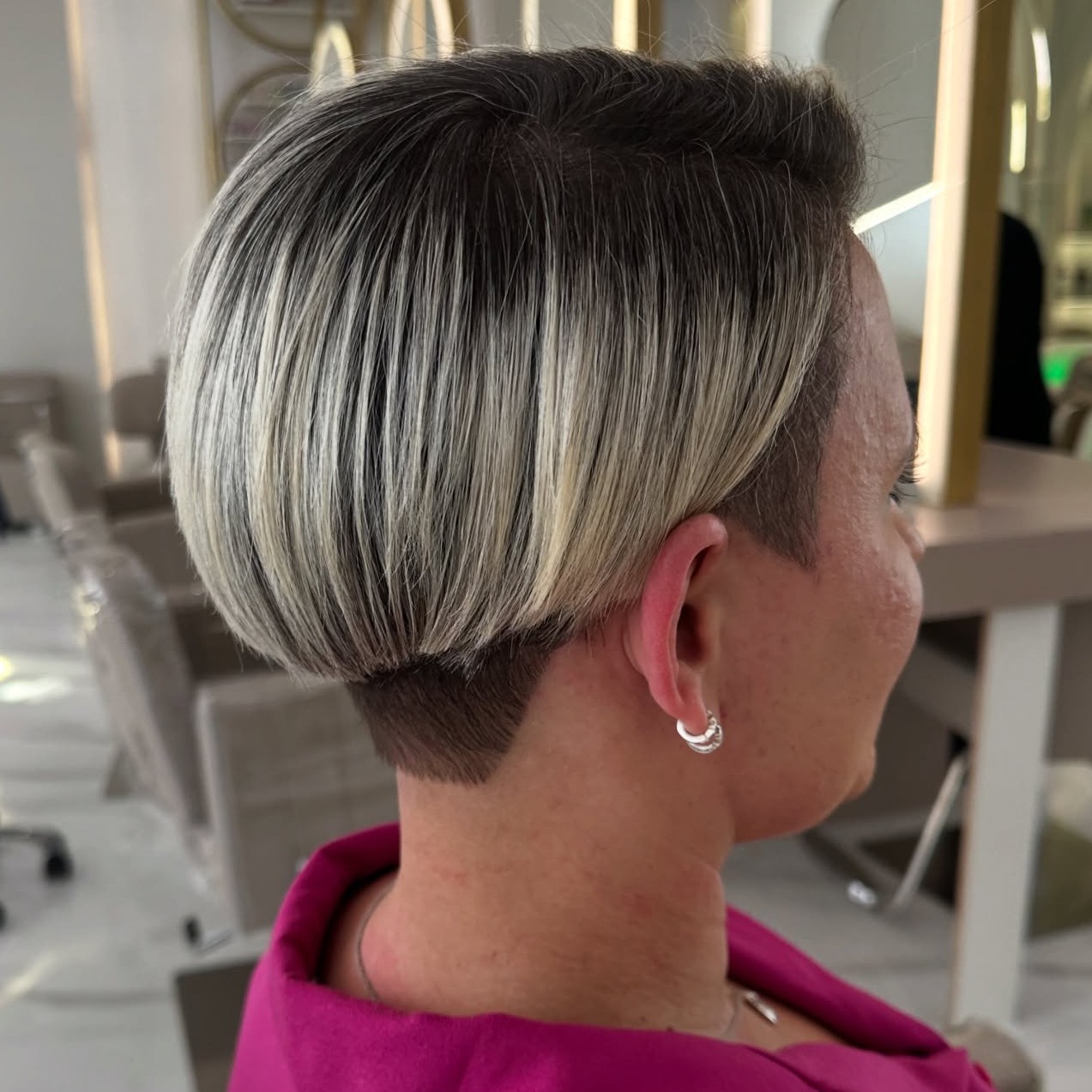 Playing with both color and cut can result in a dynamic and captivating hairstyle, allowing for a bold statement. Shave down the hair on the nape and temples to the scalp, leaving the longer strands on the crown and dyeing them white blonde.