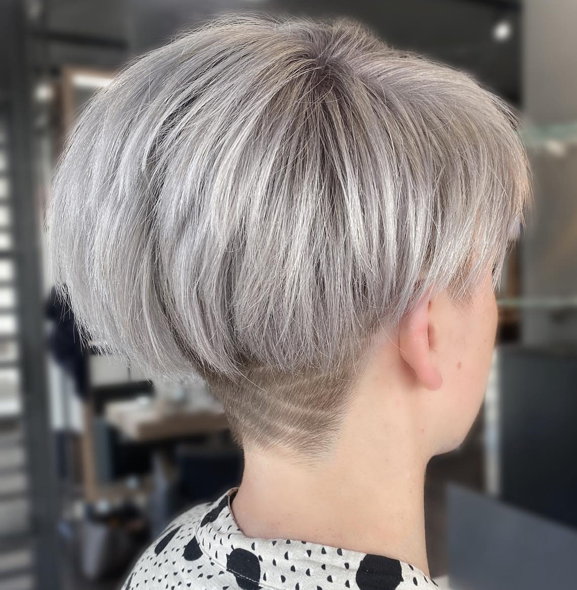 Shaving a part of your hair isn’t restricted to short hair only! For a look that says I’m feminine with a wild side, long hair with a shave underneath is your next request when you visit the salon. For extra spunk, dye your natural hair an eye-catching hair color like this ice grey, for example.