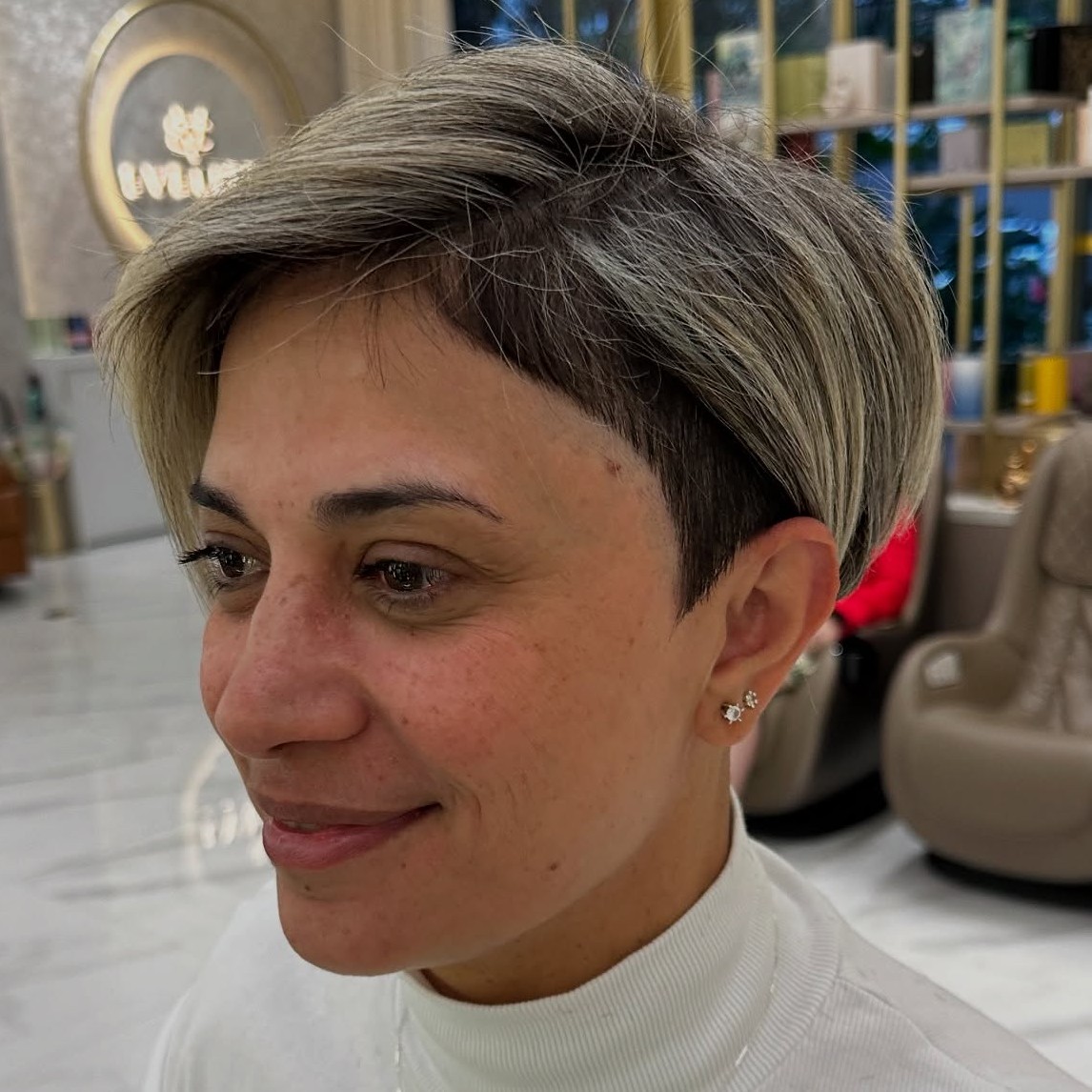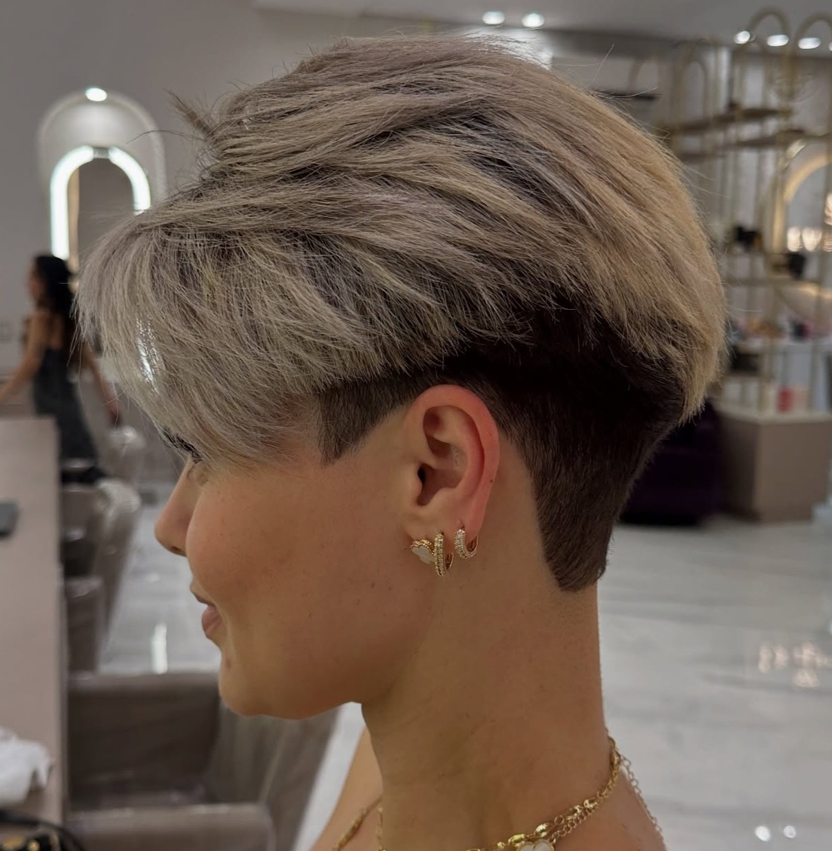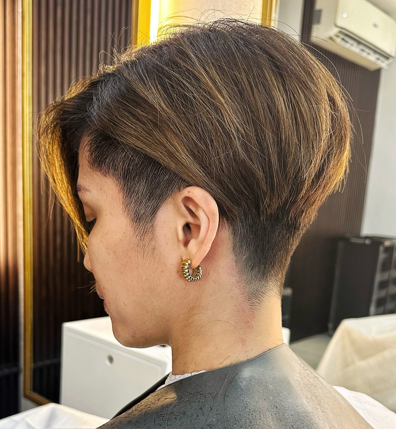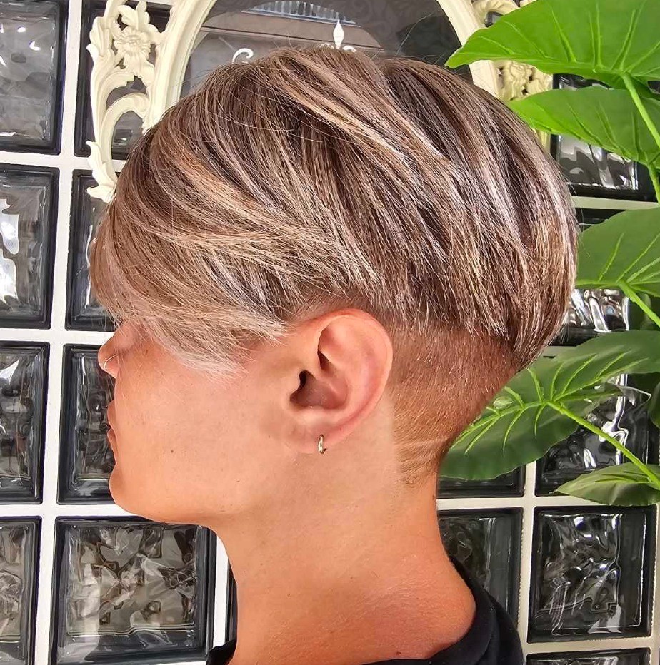 Long pixie haircuts provide more versatility than you may think of, making them suitable for almost all face shapes. They will perfectly match ultra-short sides and natural hair tones enhanced with subtle highlights.