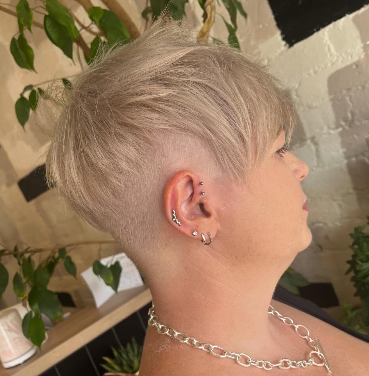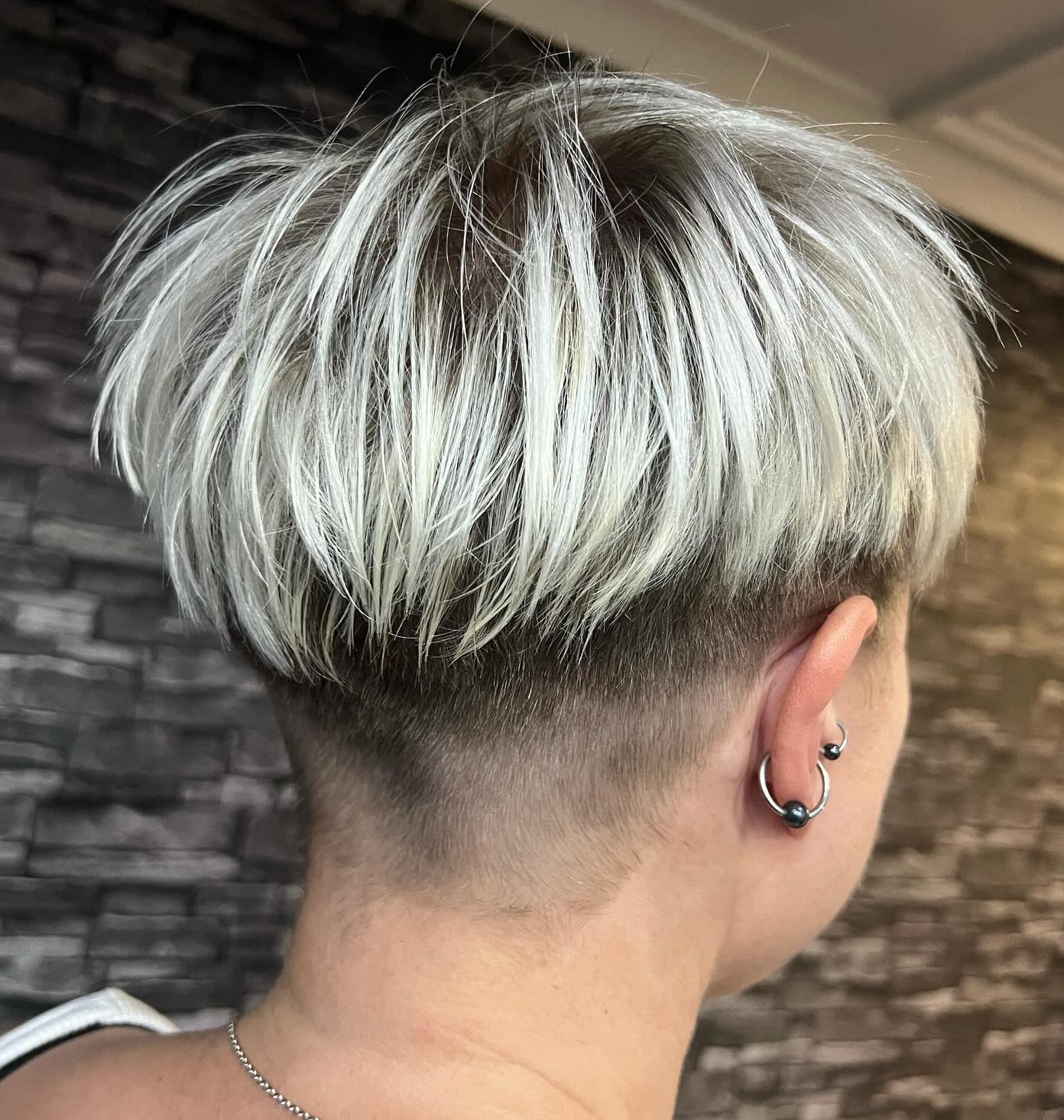 Playing with both color and cut can result in a dynamic and captivating hairstyle, allowing for a bold statement. Shave down the hair on the nape and temples to the scalp, leaving the longer strands on the crown and dyeing them white blonde.