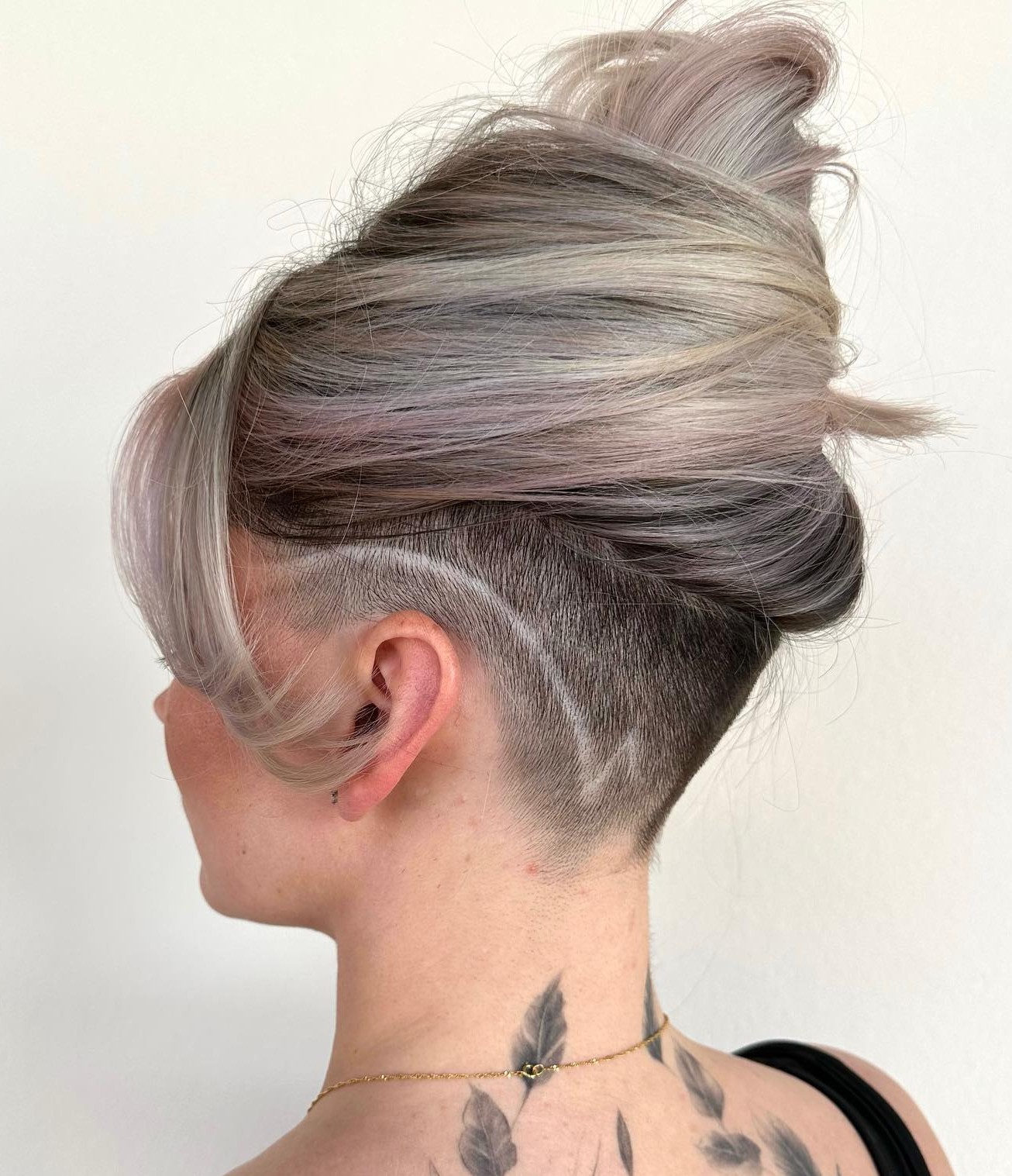 Shaving a part of your hair isn’t restricted to short hair only! For a look that says I’m feminine with a wild side, long hair with a shave underneath is your next request when you visit the salon. For extra spunk, dye your natural hair an eye-catching hair color like this ice grey, for example.