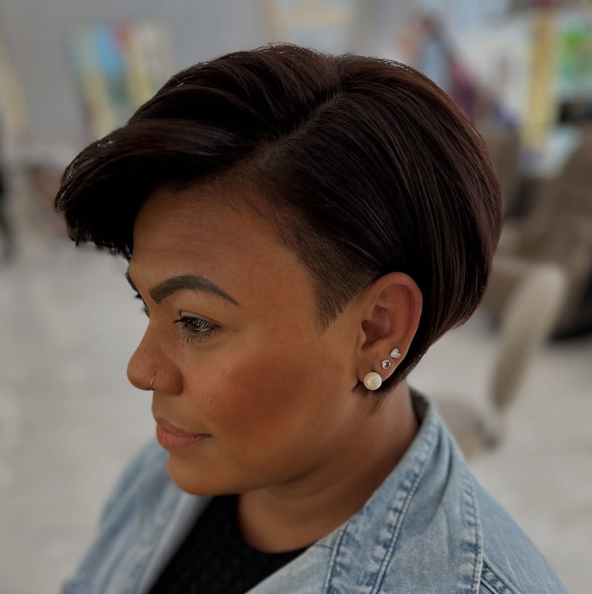 A medley of short, sweet, bold, and soft, here is a no-fuss cut with one side trimmed short. With longer back layers and pieces that asymmetrically frame the face, this faux half mohawk style is sure to pop in any environment.