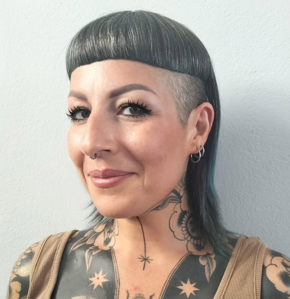 The sides buzzed to the scalp create a sharp contrast with long, messy mullet, allowing you to emphasize your boldness. Incorporating bangs into this style will also make your choppy hair appear thicker, which works well for anyone with finer hair.