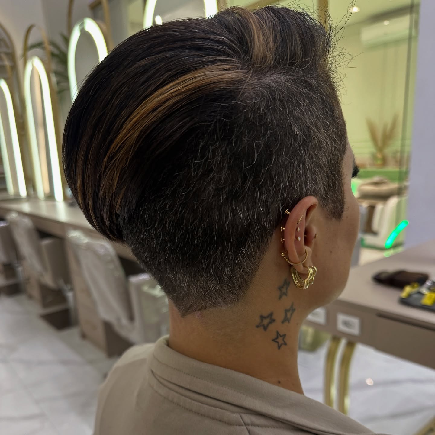 This style perfectly balances rebellion with a chic and polished look. The neat linear design adds a daring yet beautiful accent to long hair styled in a sleek, glossy ponytail, giving more space for experiments with styling.