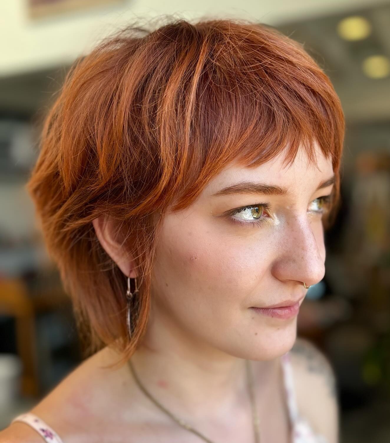 A blunt bob with wispy bangs is key to nailing an alternative look. While many are used to seeing this cut in dark brown or black, wearing it in a light ginger shade brings a new life to it. Instead of being sultry and mysterious, ginger and light blonde shades uplift the style.