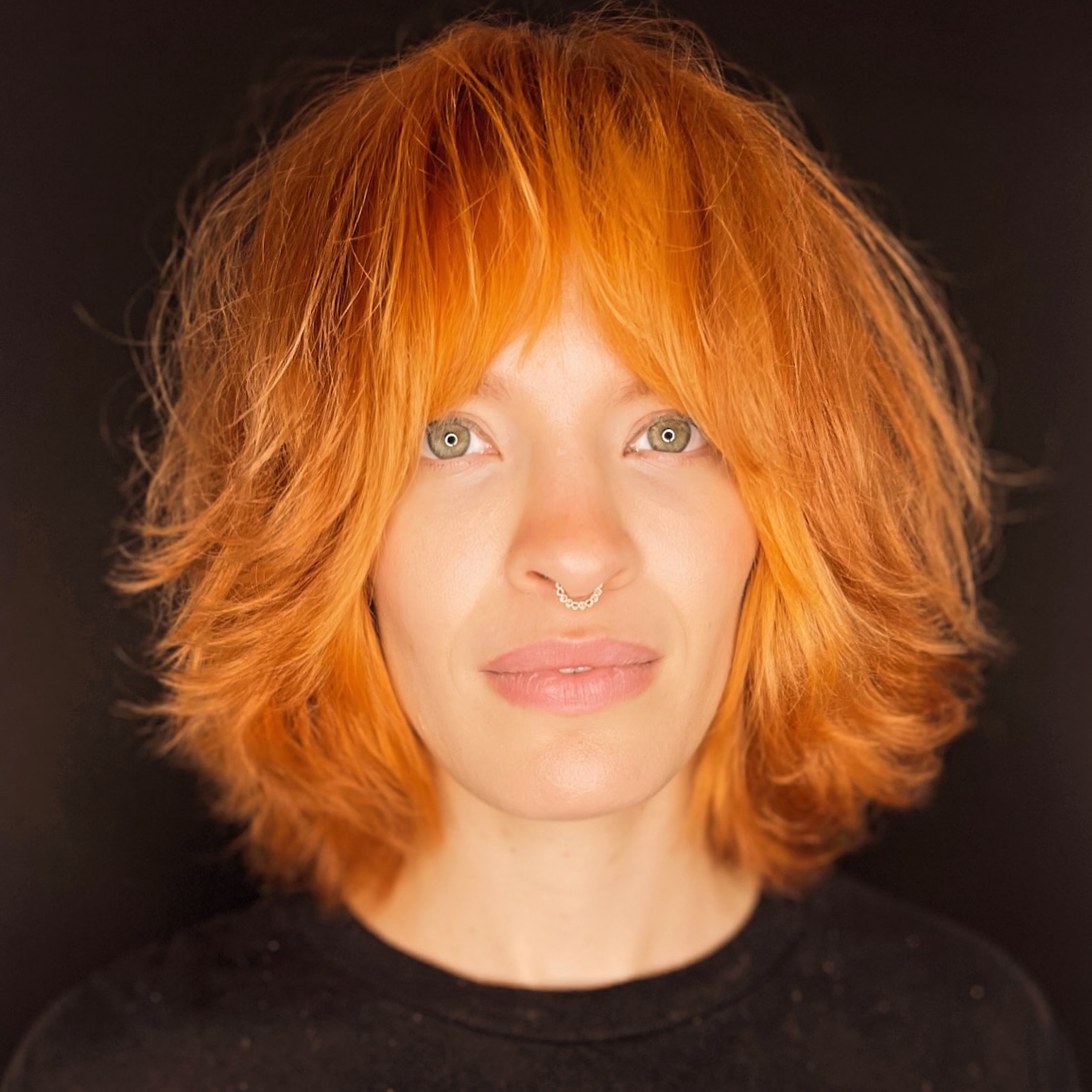 A blunt bob with wispy bangs is key to nailing an alternative look. While many are used to seeing this cut in dark brown or black, wearing it in a light ginger shade brings a new life to it. Instead of being sultry and mysterious, ginger and light blonde shades uplift the style.