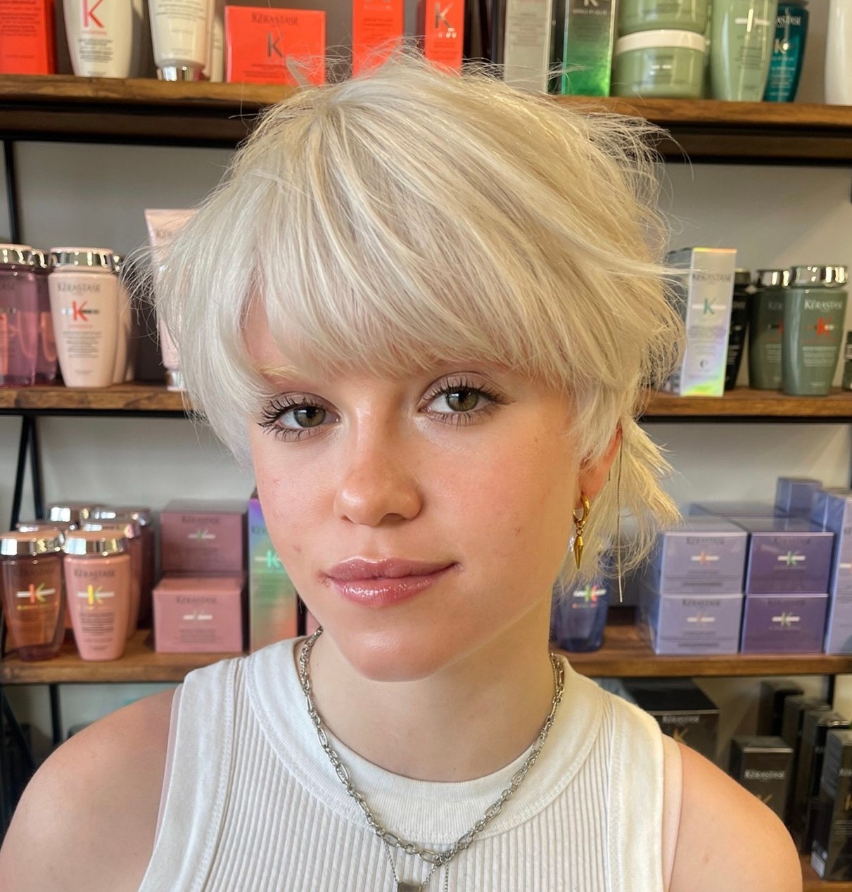 To make a statement with short hair and side bangs, opt for a dramatic sweep. Swooped over the wearer’s face, layered hair will frame anyone’s features well. The look is perfect in icy platinum blonde and will elevate any outfit.