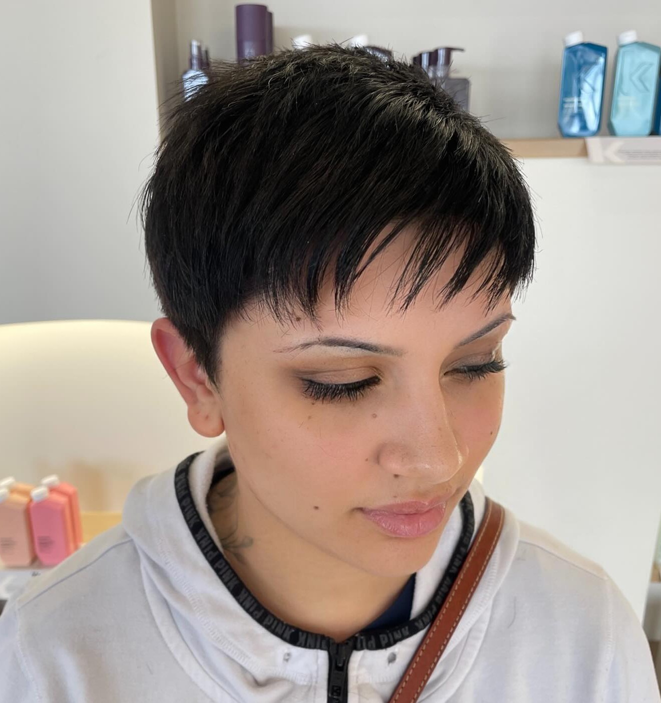 The undercut pixie has surged in popularity across all genders. If you have big eyes and a triangular or oval face, you can go for a bold undercut with a razored element and style bangs short to open up your forehead.