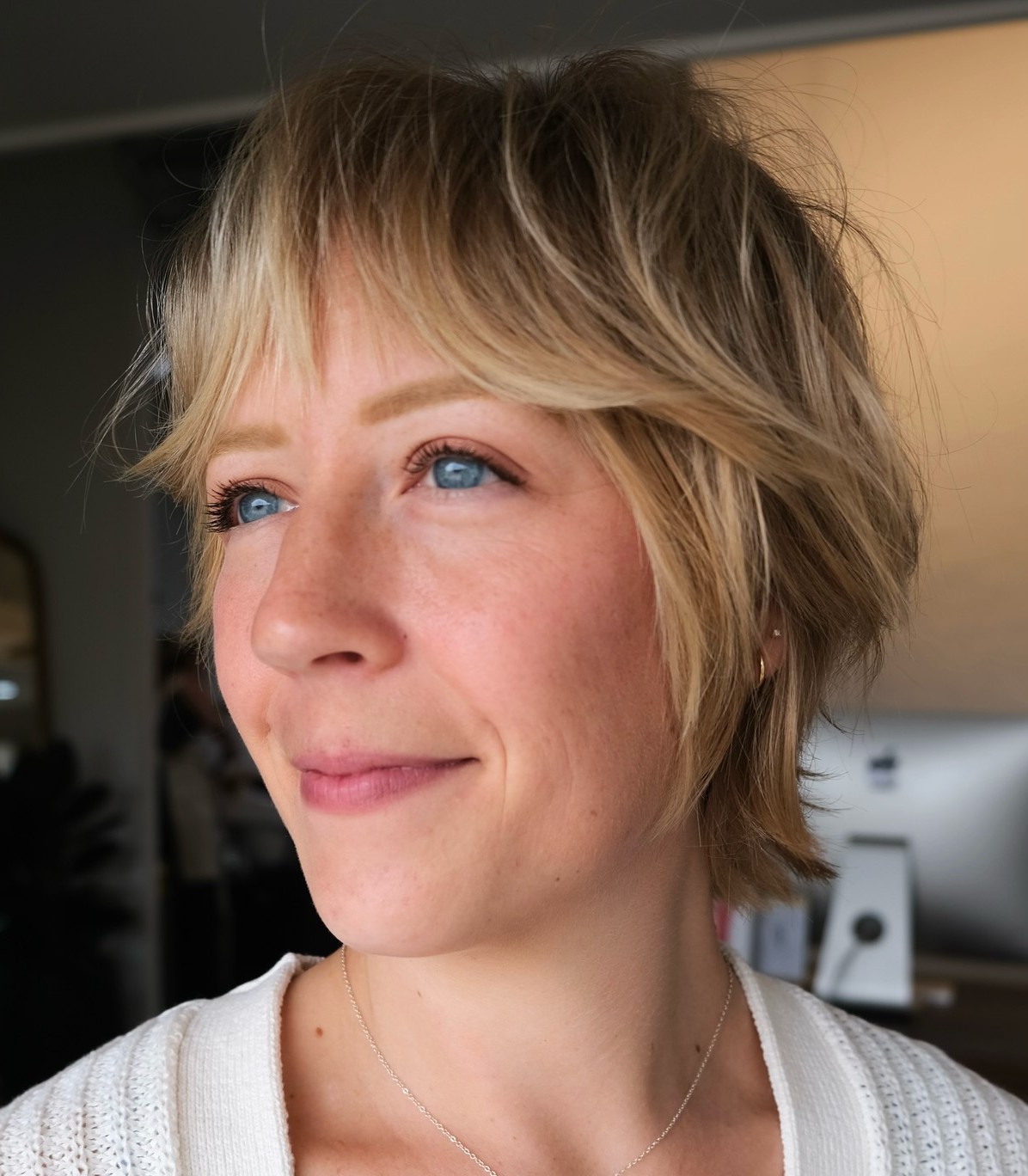 To make a statement with short hair and side bangs, opt for a dramatic sweep. Swooped over the wearer’s face, layered hair will frame anyone’s features well. The look is perfect in icy platinum blonde and will elevate any outfit.