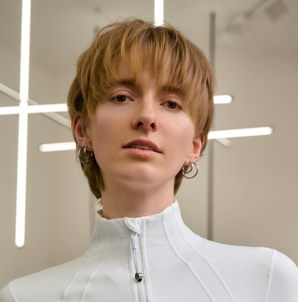 A blunt bob with wispy bangs is key to nailing an alternative look. While many are used to seeing this cut in dark brown or black, wearing it in a light ginger shade brings a new life to it. Instead of being sultry and mysterious, ginger and light blonde shades uplift the style.