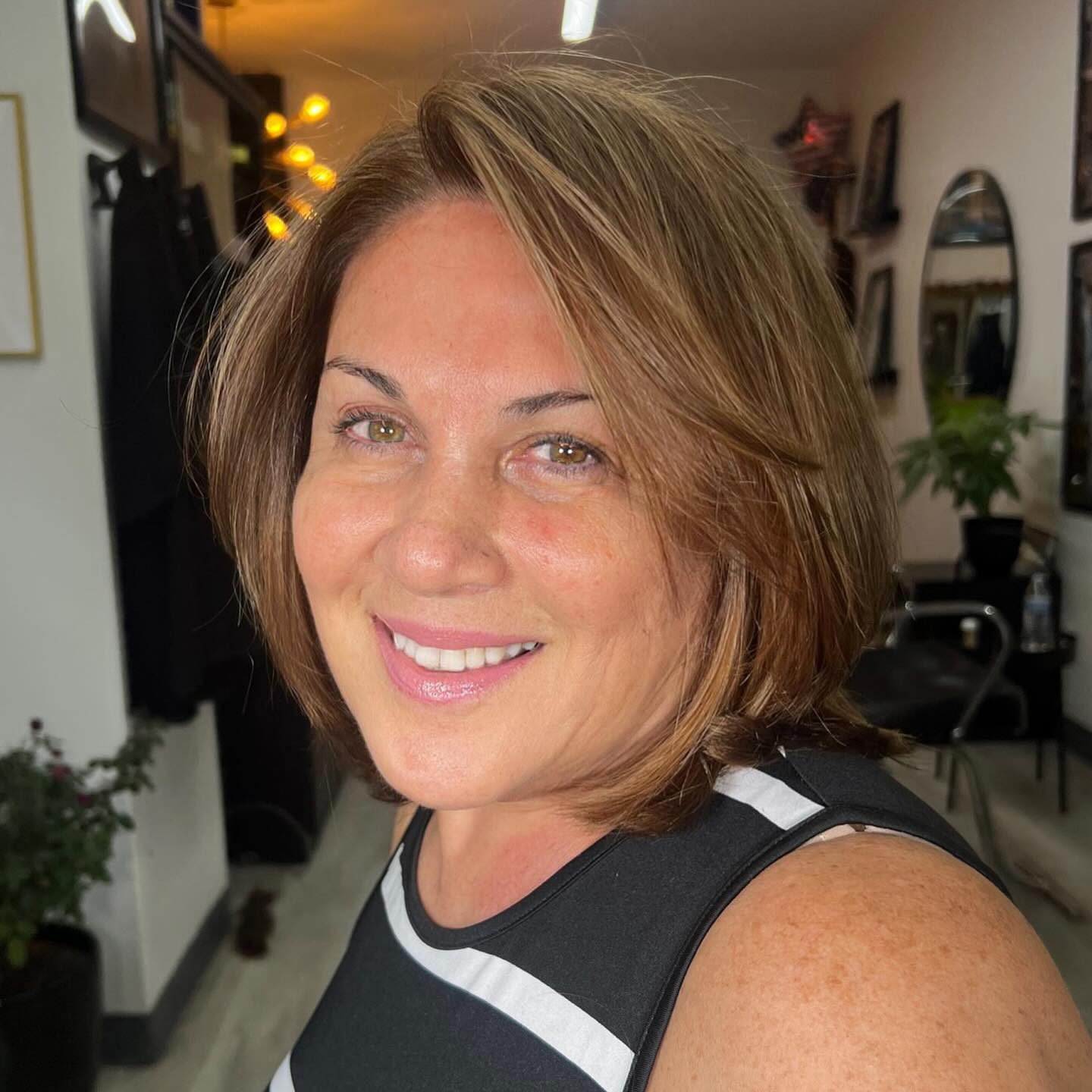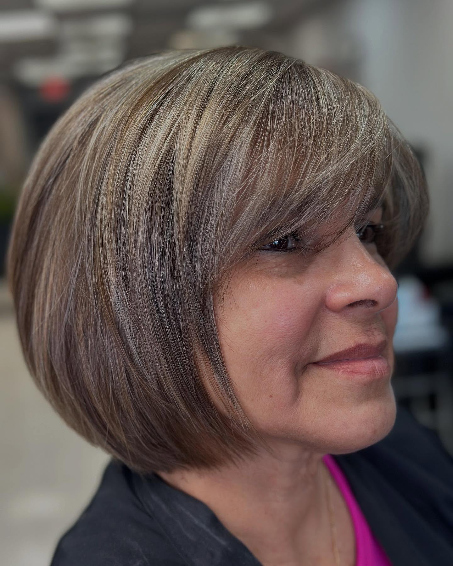 The long side pieces of the face-framing bob act as extended bangs and help slim down the round face and double chin. The strategically placed soft brown balayage is a classic color choice that harmonizes with most fair-to-medium complexions.