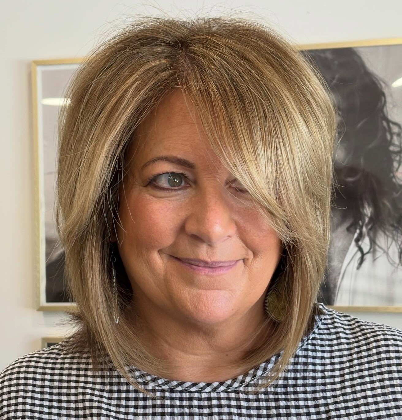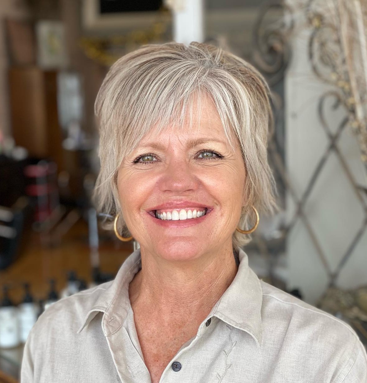 The right hairstyles for women over 50 with round faces have features that help slim the face and add a bit of character to your appearance. Keep the hair a bit tousled and try a slightly off-center part to create the effect of peek-a-boo bangs.