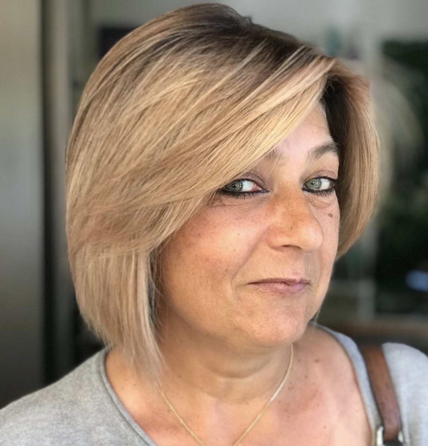 The long side pieces of the face-framing bob act as extended bangs and help slim down the round face and double chin. The strategically placed soft brown balayage is a classic color choice that harmonizes with most fair-to-medium complexions.