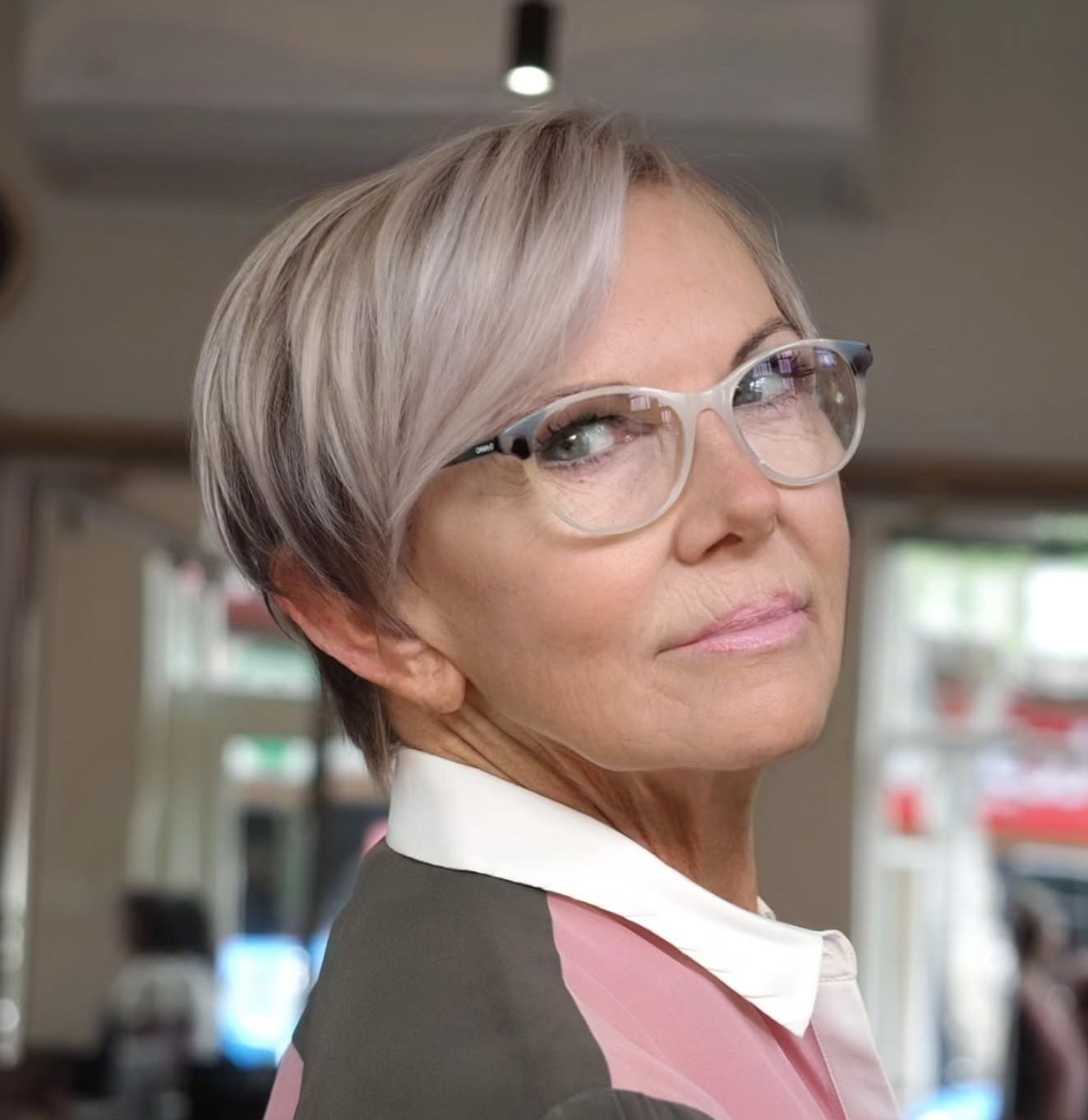 A short pixie cut with long side bangs is an ideal choice for women with round faces and glasses. The thick, brushed-forward crown section adds height to the look, and together with elongated sideburns and angular frames, slims down the face and brings it the desired edge.