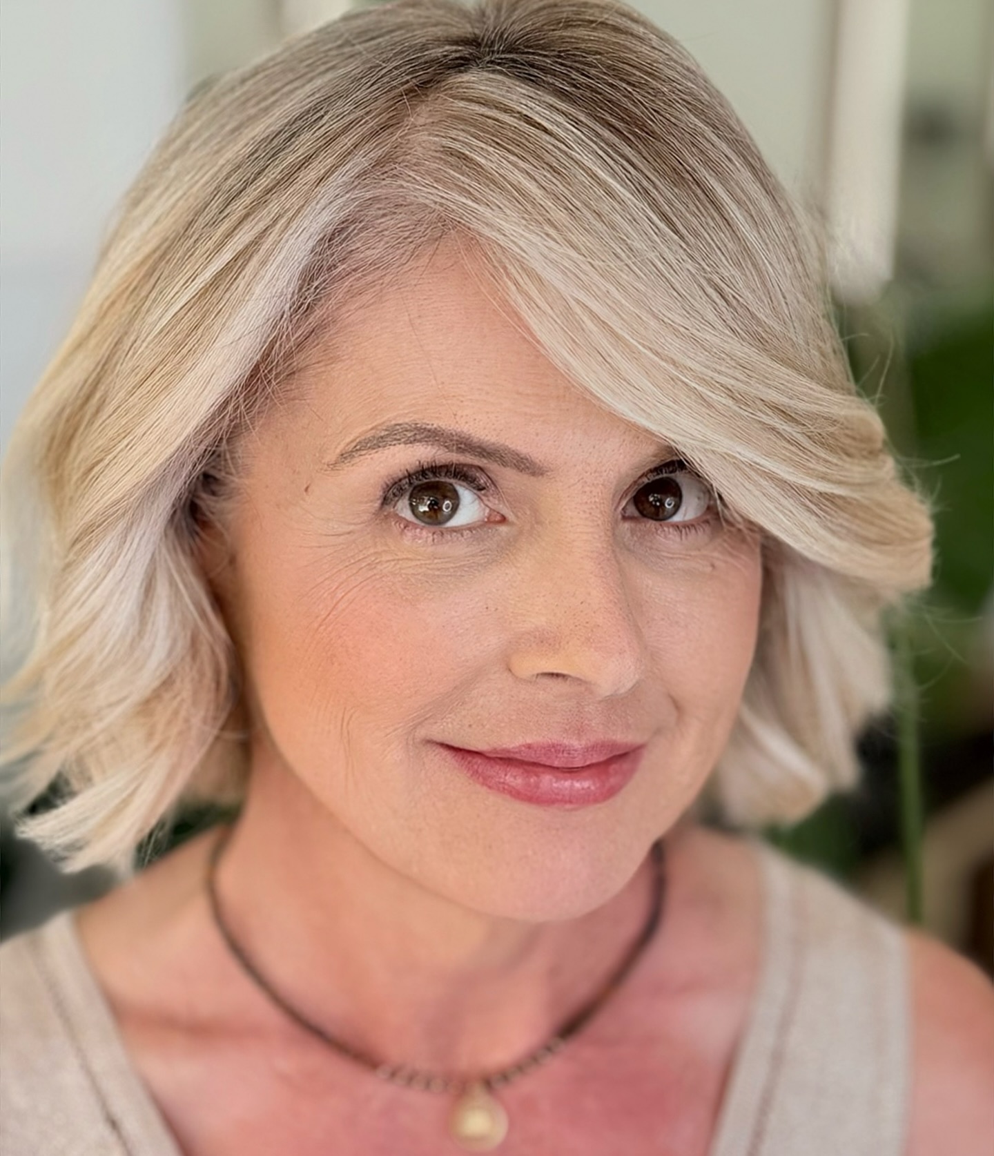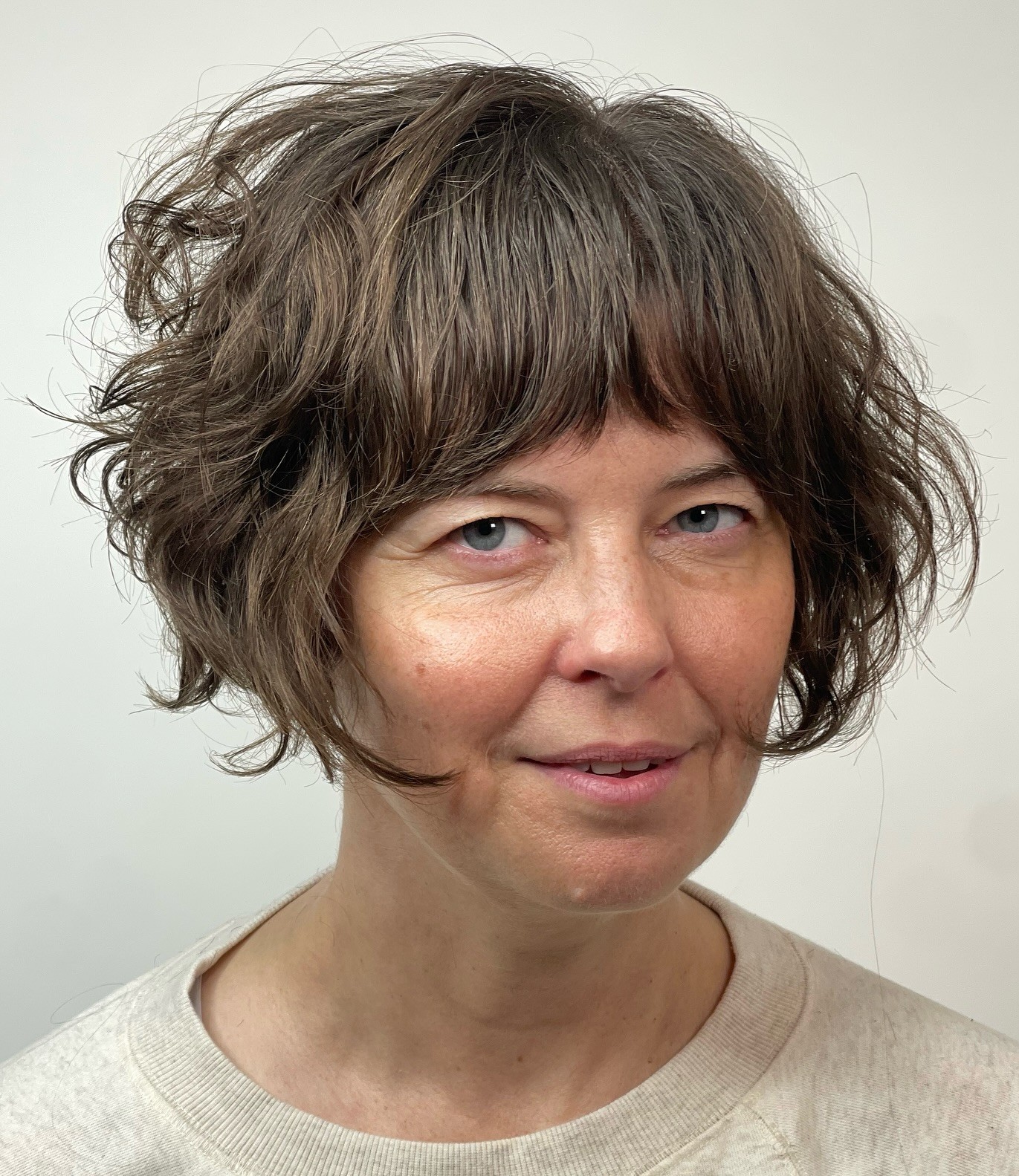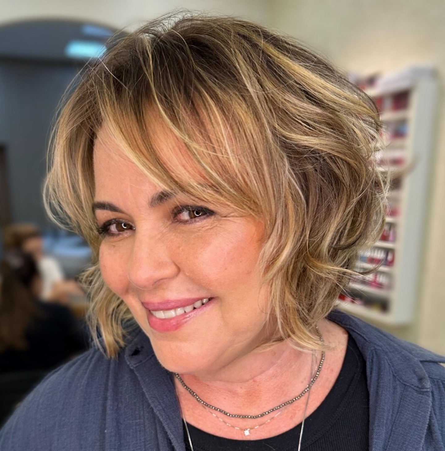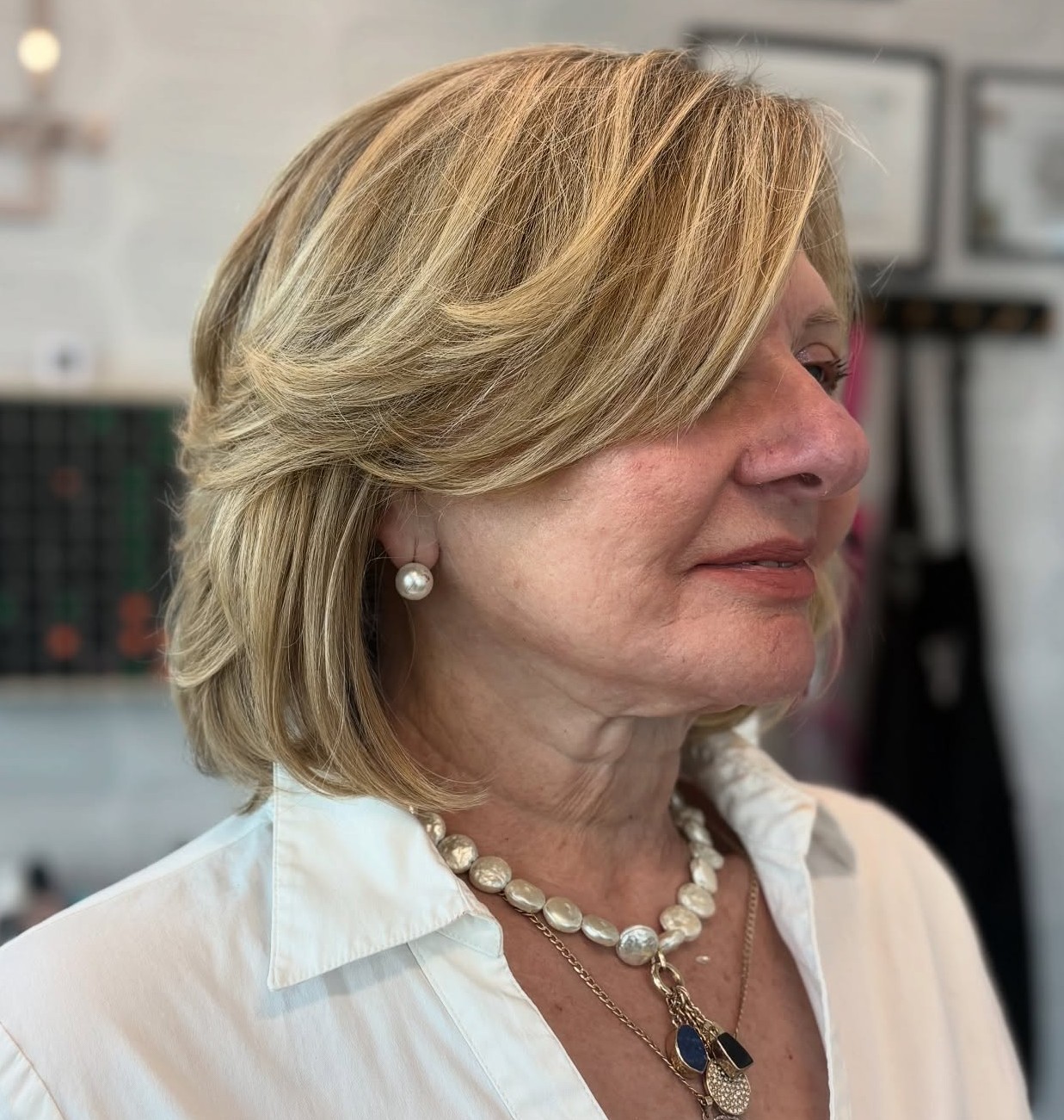 The right hairstyles for women over 50 with round faces have features that help slim the face and add a bit of character to your appearance. Keep the hair a bit tousled and try a slightly off-center part to create the effect of peek-a-boo bangs.