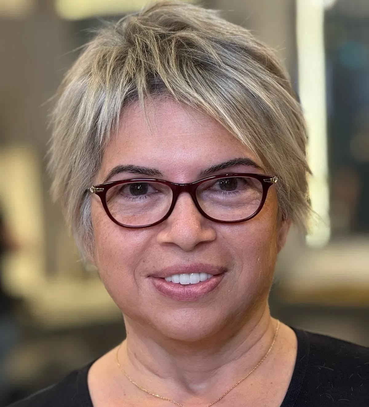 A short pixie cut with long side bangs is an ideal choice for women with round faces and glasses. The thick, brushed-forward crown section adds height to the look, and together with elongated sideburns and angular frames, slims down the face and brings it the desired edge.