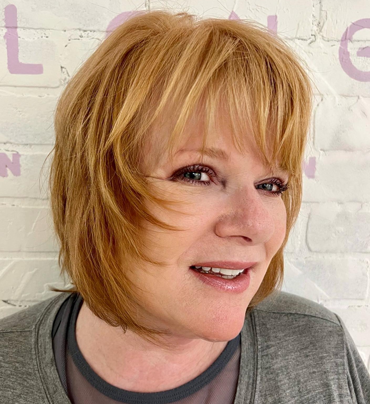 When choosing hairstyles for women over 50 with round faces, it’s important to look for cuts that help elongate the face. A symmetrical bob with textured bangs gives off a youthful vibe, making you look friendly and approachable. The vibrant rusty-auburn color is attractive for most skin tones.