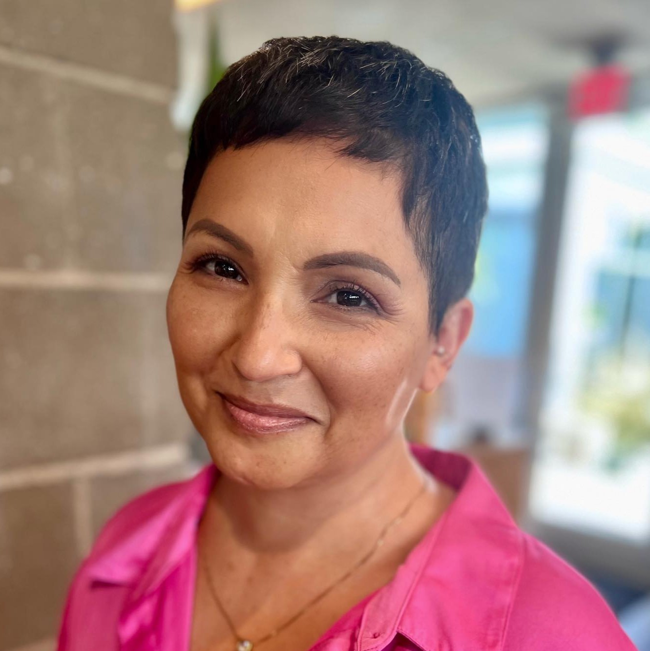 Keep your hair clipped closely, but be sure to leave the top section long enough to show off your bright highlights. The razored bangs and long sideburns flatter both the face shape and the hair texture.