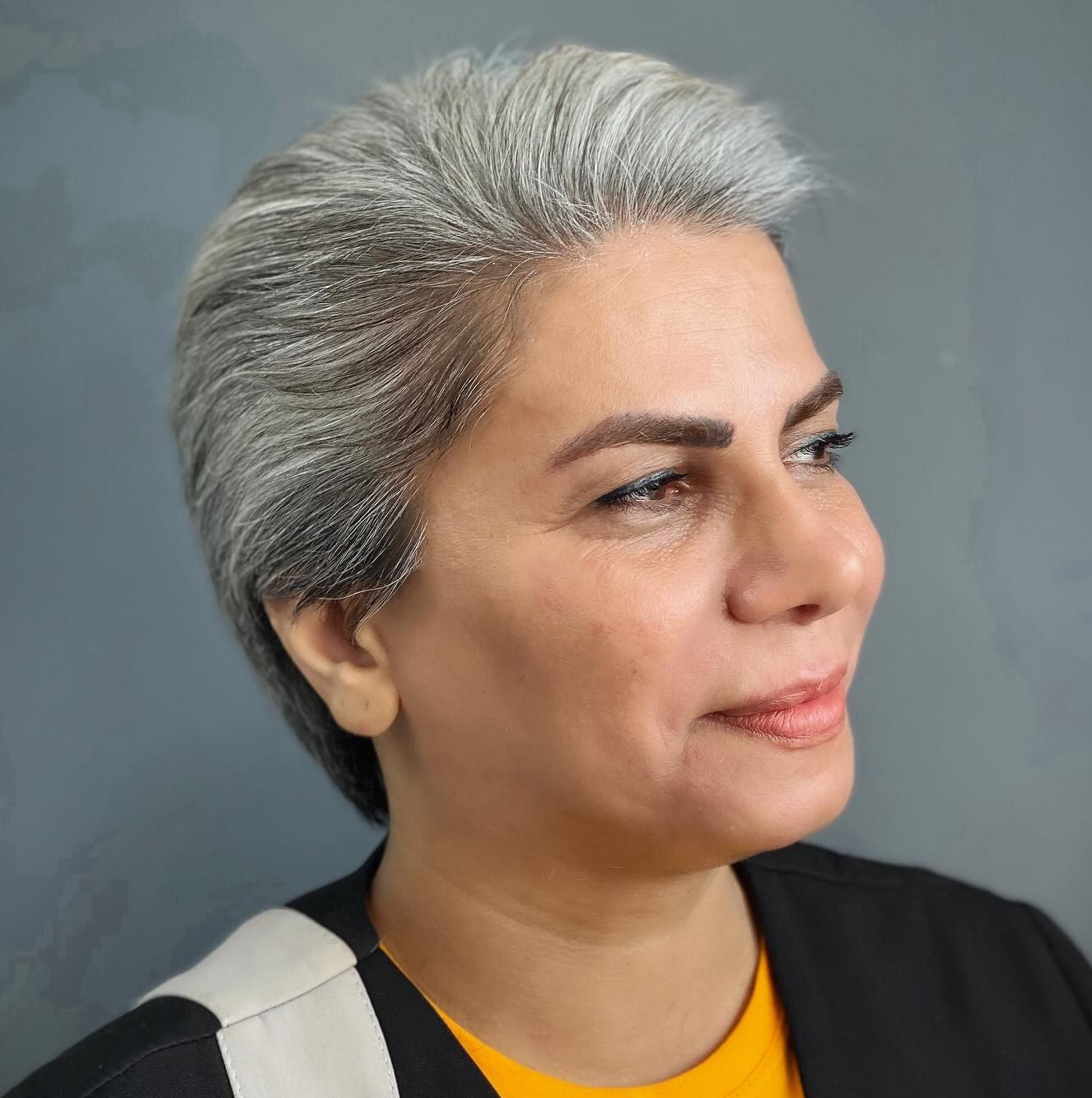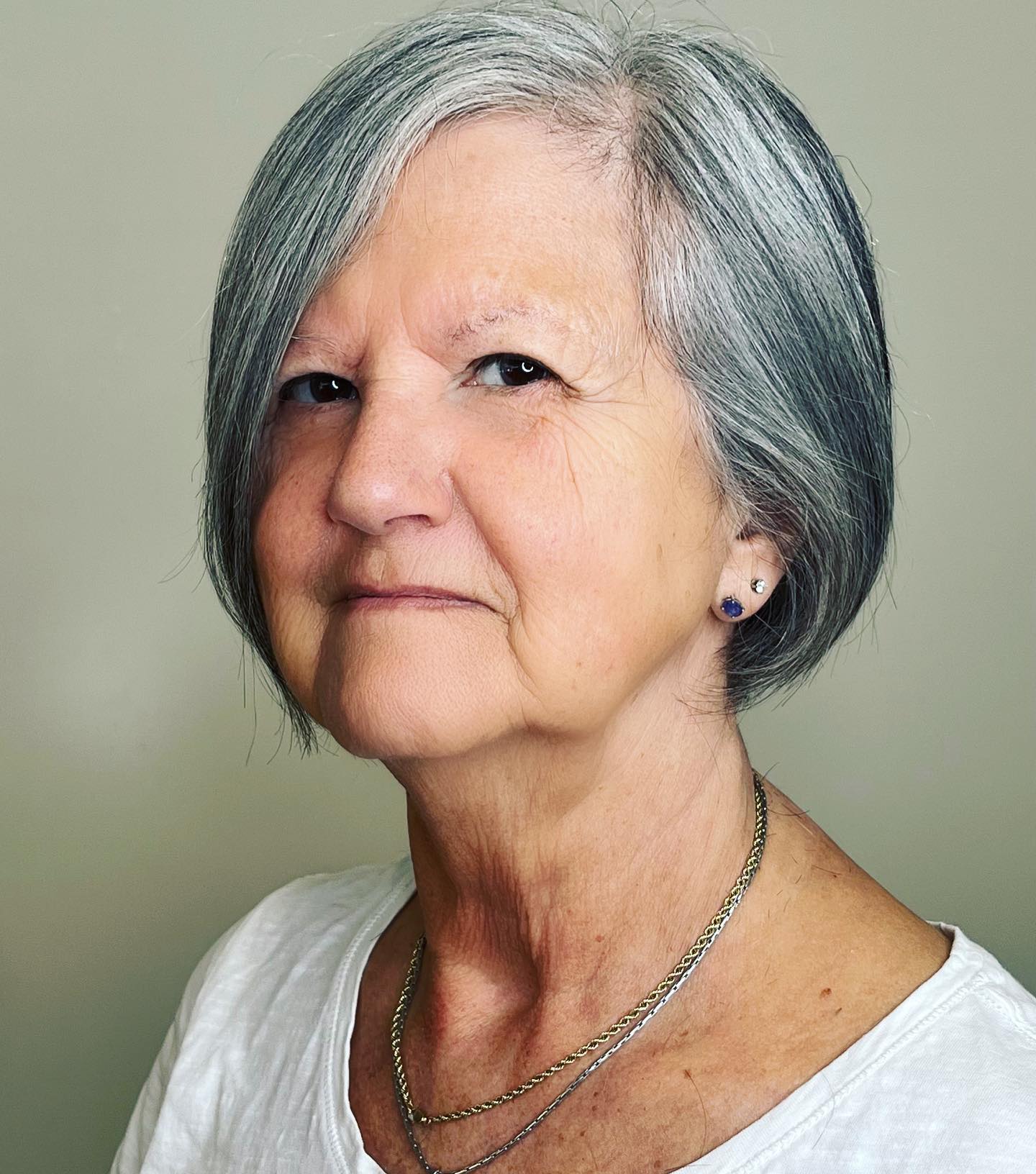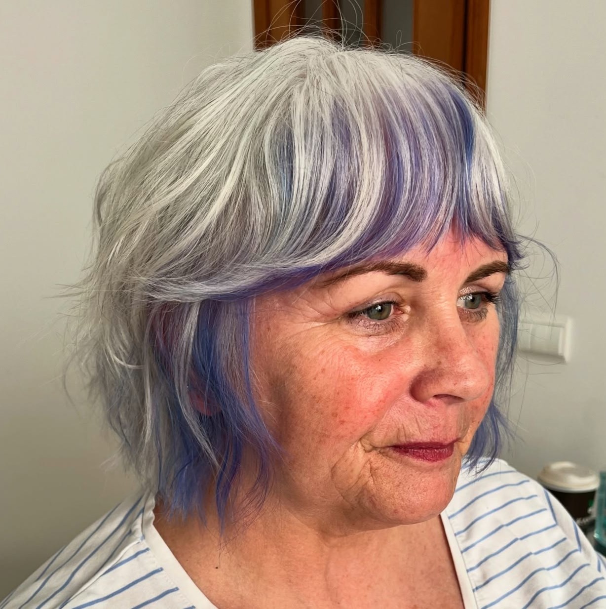 Add a modern twist to a standard short gray pixie by embracing the popular lavender tint. If your hair is a little thin, tease the roots and leave long bangs to sweep across the forehead. The vertical position of the angled side pieces helps to narrow a too-round face.