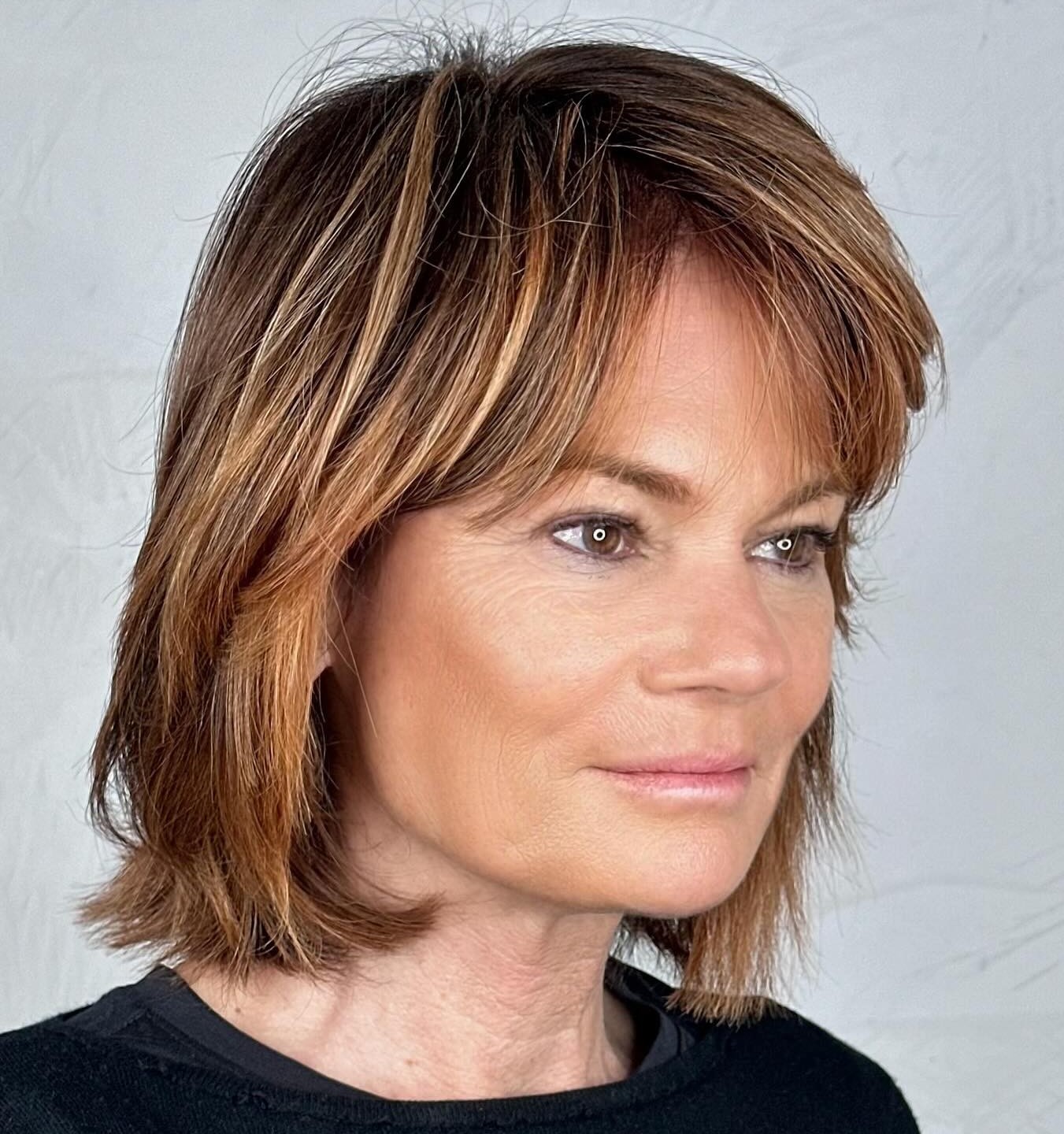 The right hairstyles for women over 50 with round faces have features that help slim the face and add a bit of character to your appearance. Keep the hair a bit tousled and try a slightly off-center part to create the effect of peek-a-boo bangs.
