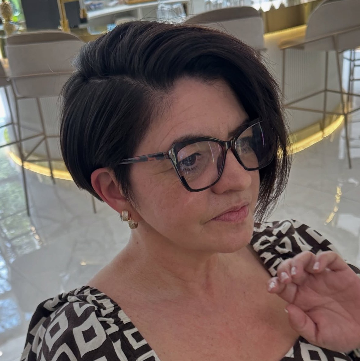 A short pixie cut with long side bangs is an ideal choice for women with round faces and glasses. The thick, brushed-forward crown section adds height to the look, and together with elongated sideburns and angular frames, slims down the face and brings it the desired edge.