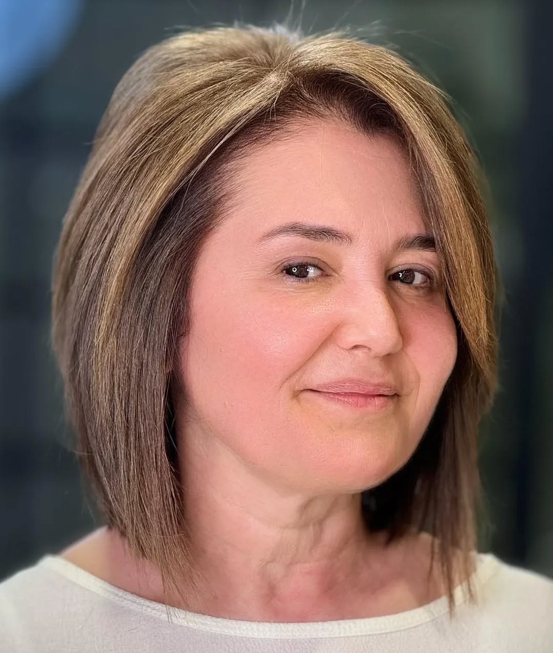 The long side pieces of the face-framing bob act as extended bangs and help slim down the round face and double chin. The strategically placed soft brown balayage is a classic color choice that harmonizes with most fair-to-medium complexions.