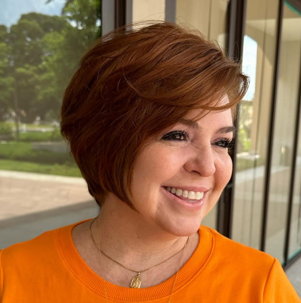 When choosing hairstyles for women over 50 with round faces, it’s important to look for cuts that help elongate the face. A symmetrical bob with textured bangs gives off a youthful vibe, making you look friendly and approachable. The vibrant rusty-auburn color is attractive for most skin tones.
