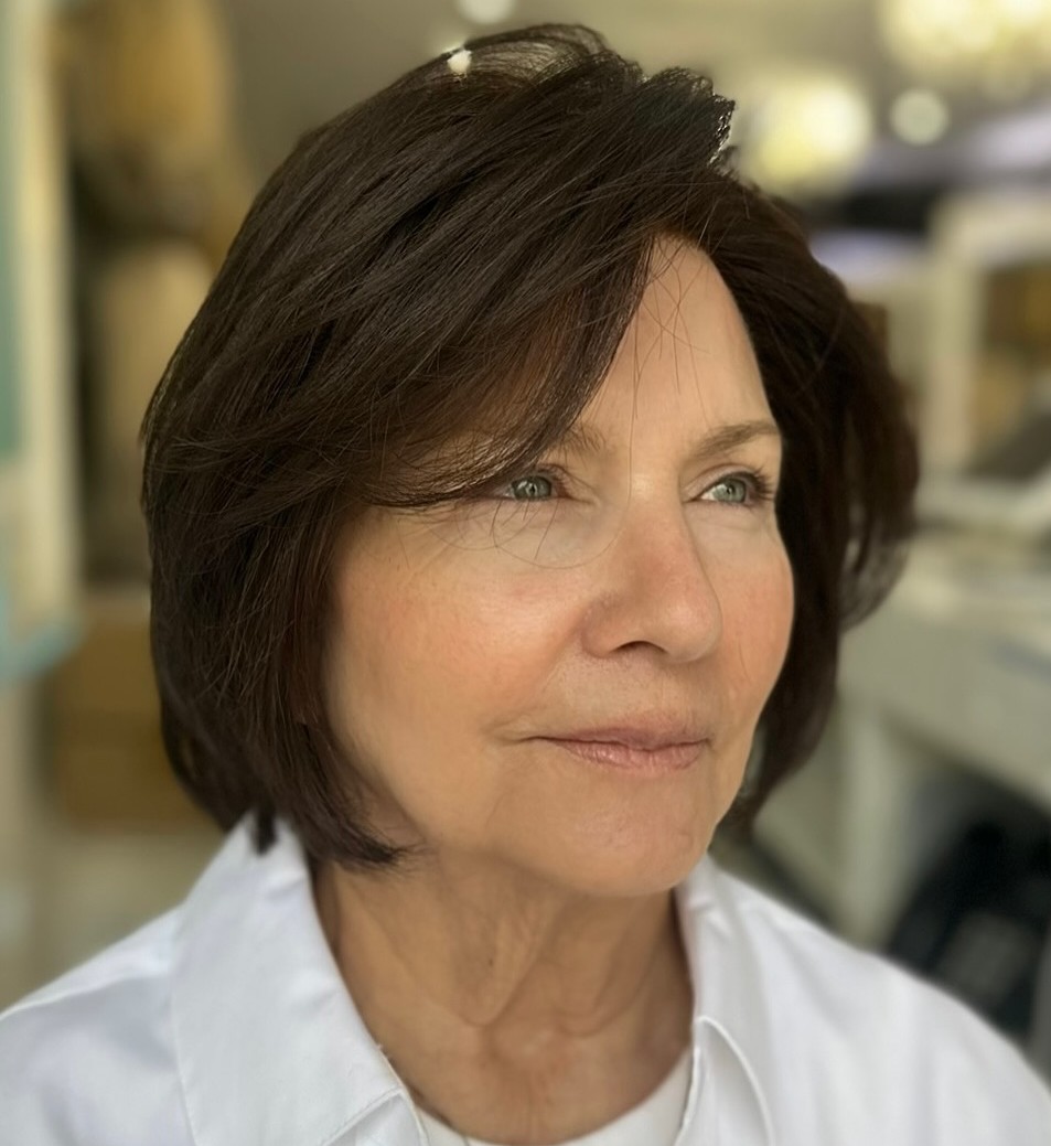 The right hairstyles for women over 50 with round faces have features that help slim the face and add a bit of character to your appearance. Keep the hair a bit tousled and try a slightly off-center part to create the effect of peek-a-boo bangs.