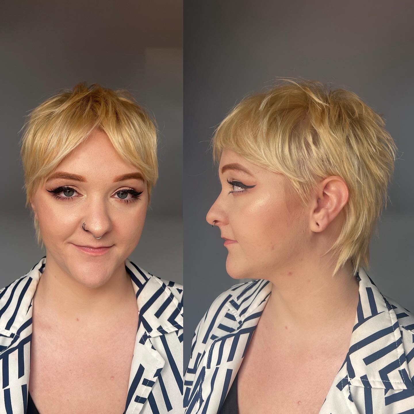 The mod pixie cut is very retro, circa ‘70s. It’s phenomenal when paired with pin-up elements such as a bold red lip, an expressive cat eye, or dramatic falsies. The simplicity of the hairstyle, though, enables you to wear any style of clothes you desire without having to worry about looking overdone.