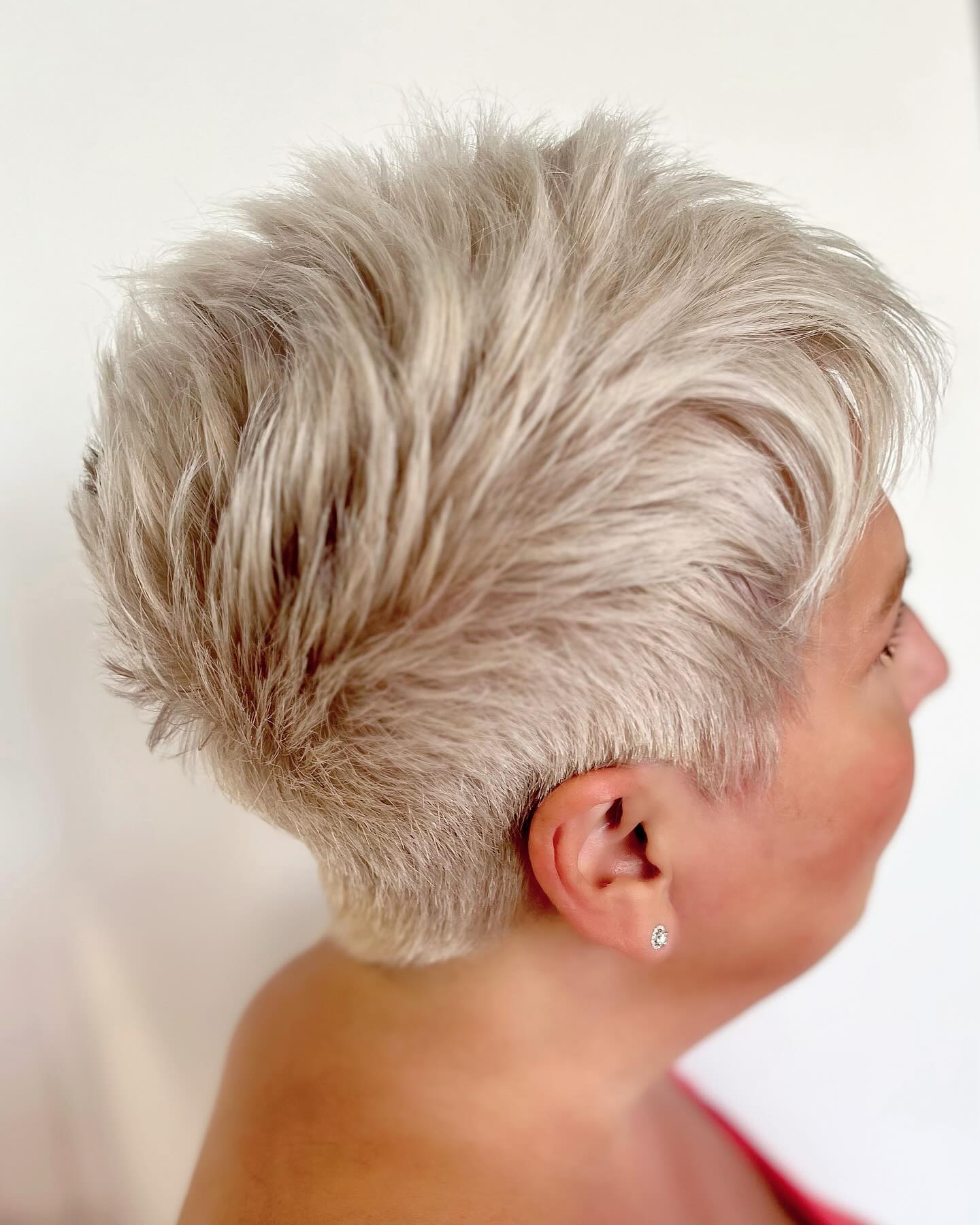 If you prefer an edgy look over a traditional pixie cut, a combination of spiky top section with sheared sides is just the ticket to your new signature style. Keep strands longer in the front, gradually shortening them on the sides and shaving them close to the scalp along the ear line.