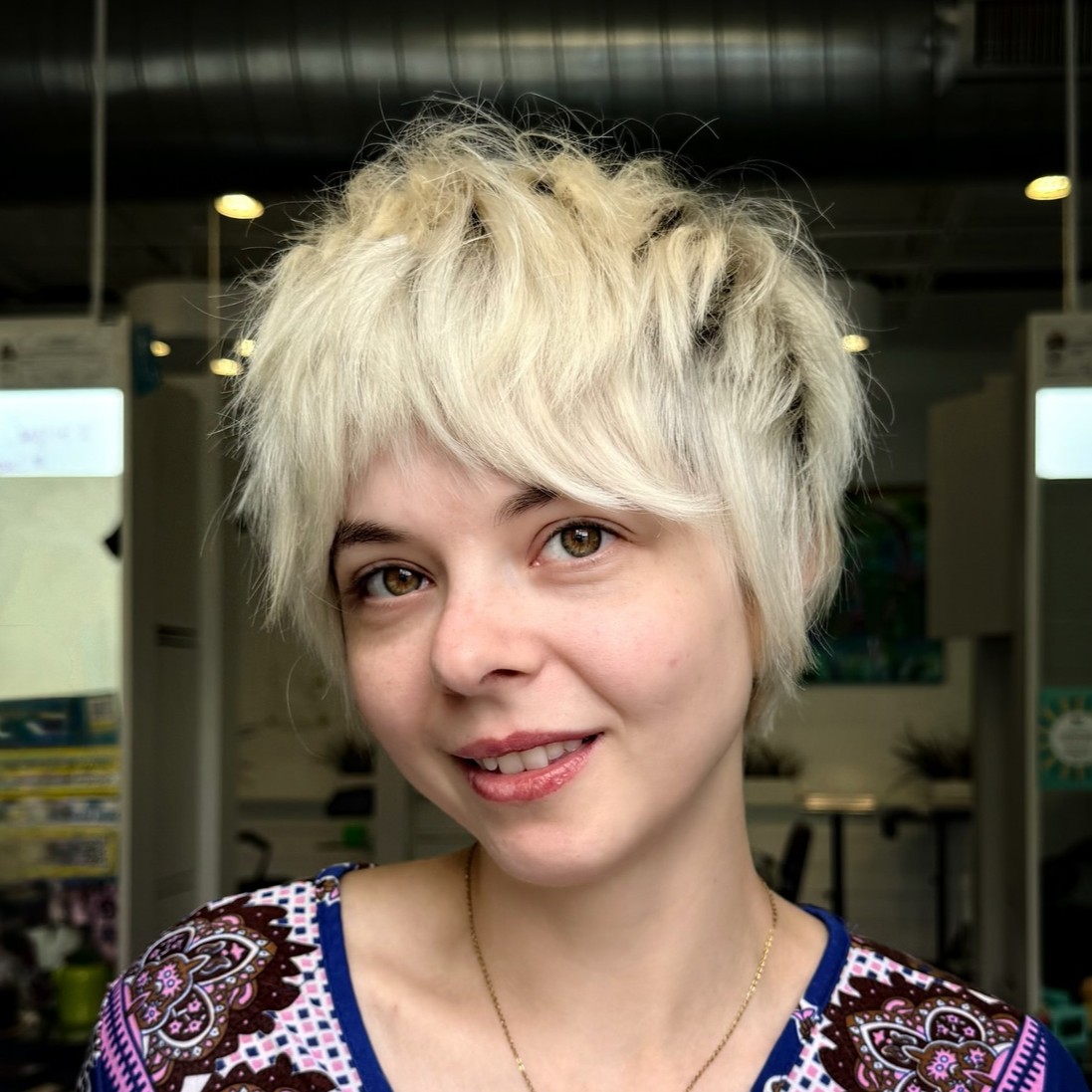 This short, textured cut with bangs is quirky and cute at the same time! If you’re into fandoms, coding, or creative gadgets, this hairstyle taps right into that energy. It’s young, fun, and it looks awesome with glasses!