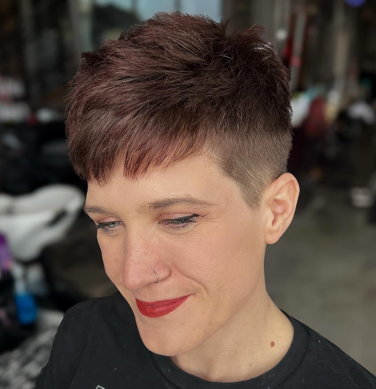 Typically, a pixie consists of a few layers and has more of a blunt edge to it. However, by adding lots of layers, you are introducing a new twist into the traditional hairdo. Also, this helps to add volume and definition to your hairstyle!