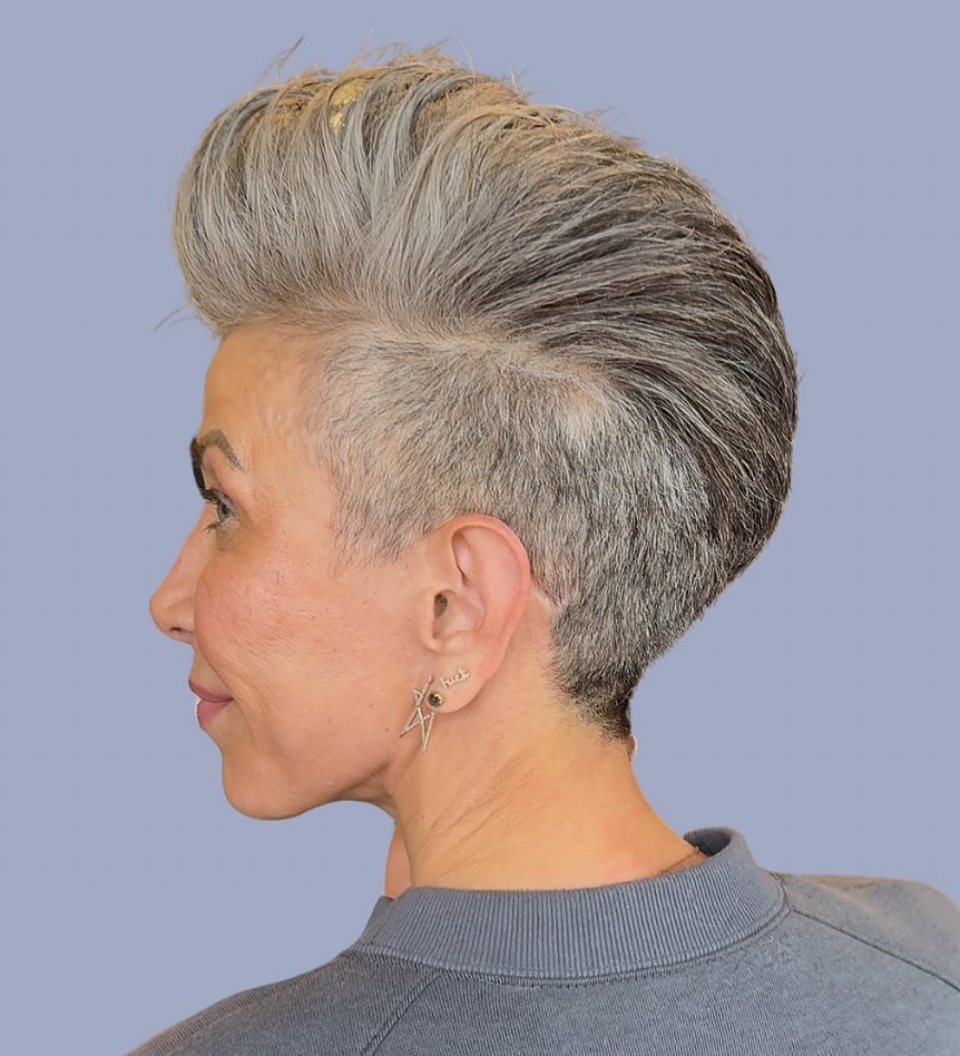 If you prefer an edgy look over a traditional pixie cut, a combination of spiky top section with sheared sides is just the ticket to your new signature style. Keep strands longer in the front, gradually shortening them on the sides and shaving them close to the scalp along the ear line.