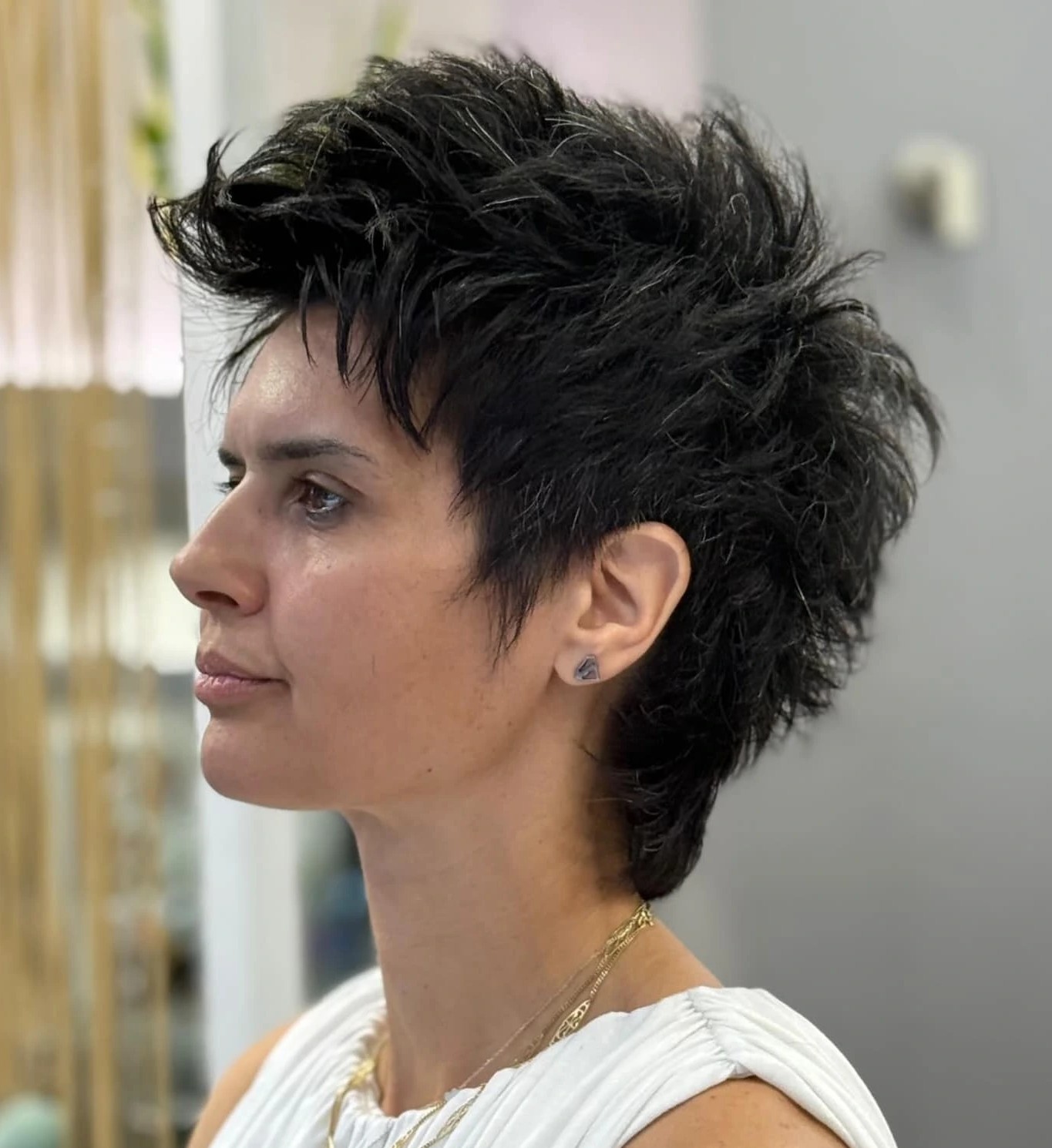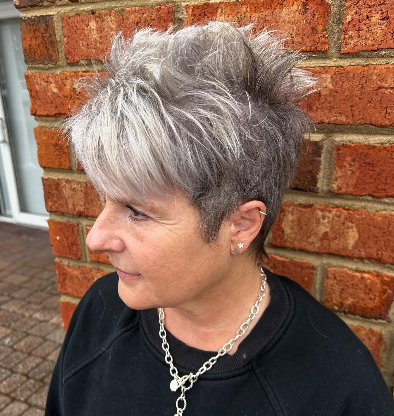 A dated cut will add years, so it’s worth choosing a cut that feels current and tailored to you. This short spiky haircut hits a sweet spot with just enough volume and messiness to be on trend without being too over the top.