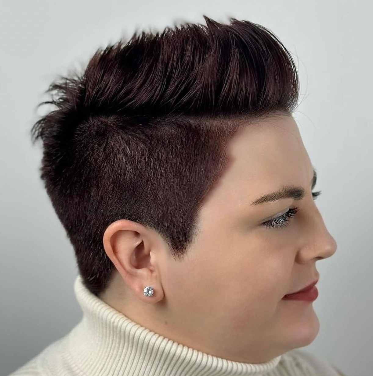 If you prefer an edgy look over a traditional pixie cut, a combination of spiky top section with sheared sides is just the ticket to your new signature style. Keep strands longer in the front, gradually shortening them on the sides and shaving them close to the scalp along the ear line.