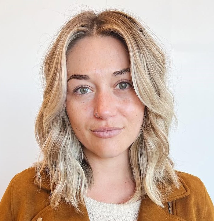 Contrary to popular belief, having the hair lightened isn’t always high-maintenance. Medium lengths showcase a stunning aesthetic with grown-out roots and highlighted lengths, creating a beautiful contrast in color. Say goodbye to costly salon appointments, as this style embraces a low-maintenance, effortlessly chic look!
