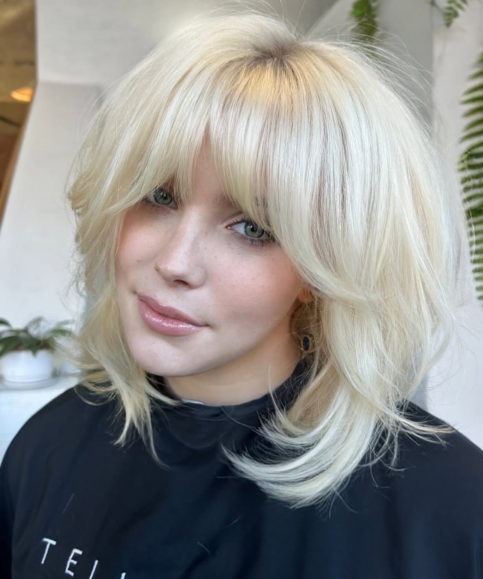 Opting for a medium-length shaggy cut and platinum locks? It may be a bold statement, but it’s the one we absolutely love! Embracing an all-over platinum hue may require regular blonde root touch-ups, but the final result is undeniably worth the effort.