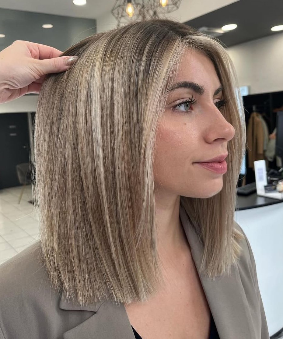 Contrary to popular belief, having the hair lightened isn’t always high-maintenance. Medium lengths showcase a stunning aesthetic with grown-out roots and highlighted lengths, creating a beautiful contrast in color. Say goodbye to costly salon appointments, as this style embraces a low-maintenance, effortlessly chic look!