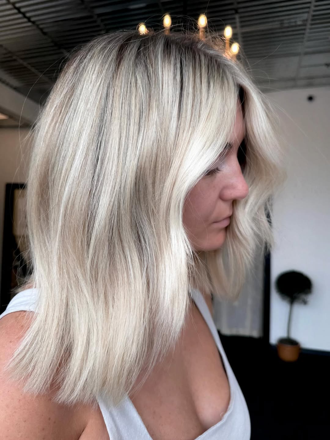 If you’re naturally fair, why not enhance your color with some strategically placed highlights? Your exceptional colorist can elevate mid-length blonde hair from ‘good’ to ‘great.’ Incorporating Lighter strands around the face and through the ends plays a special role in achieving a highly flattering finish.