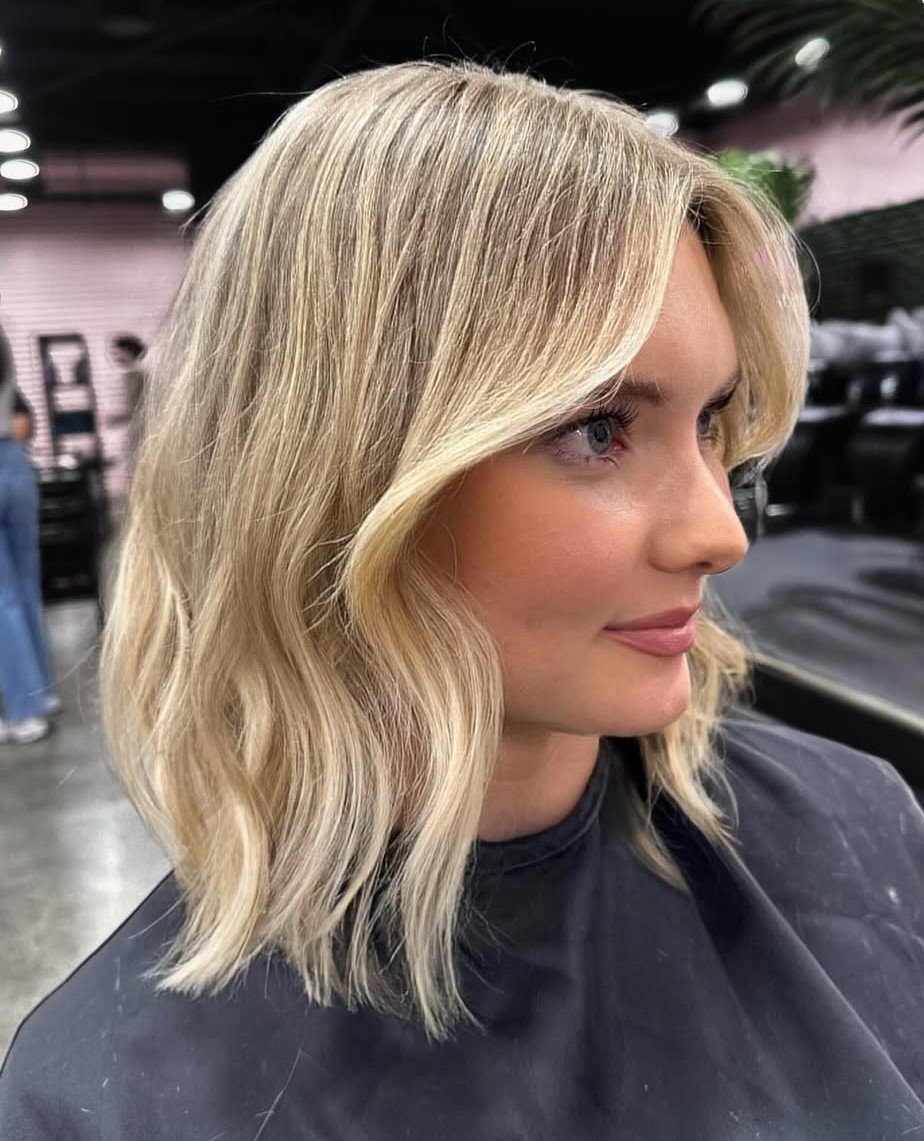 This chic midi haircut with soft layers channels a subtle 90s aesthetic, adding volume and movement around the face. The bright, dimensional look is created with balayage hair blonde technique, where lighter tones become more concentrated towards the ends for a sunlit, low-maintenance finish.