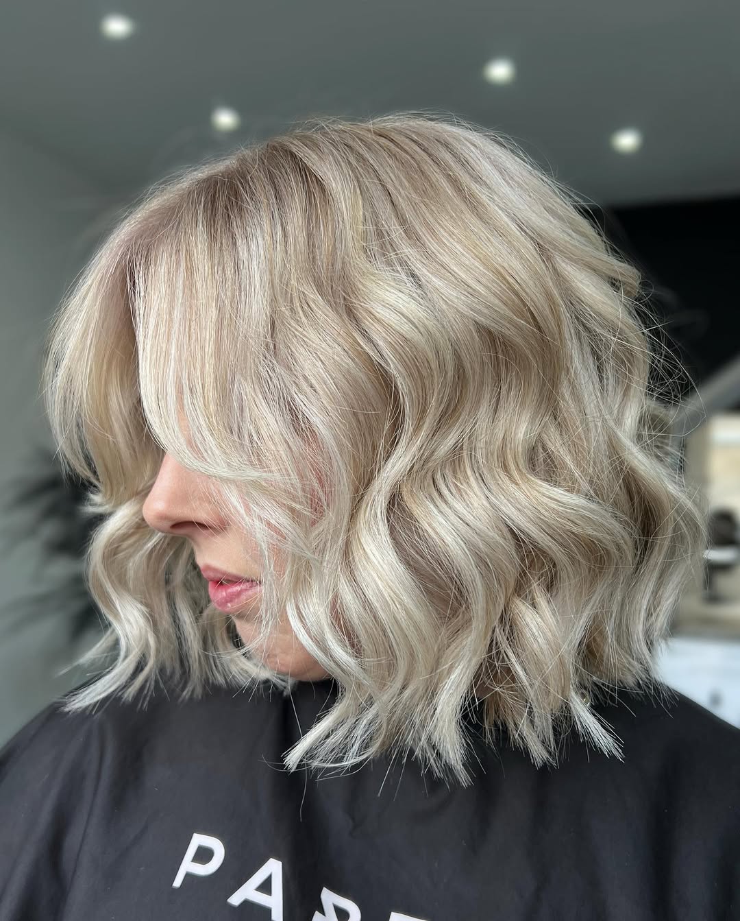 The bright, long bob is a captivating combination, great to brighten up the skin tone and eye color, especially for those with blue eyes. To achieve this style, ask for a choppy lob cut contoured by a bright blonde that will enhance the texture of the cut and add a touch of edginess. The everyday styling can be as simple as rough drying or using a diffuser, leaving the parting on one side for an effortless, lived-in vibe.