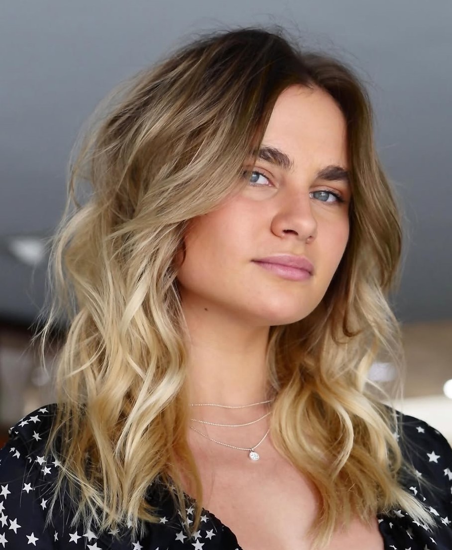 “Wind-blown” styled waves enhance medium-length blonde hair with a beautiful beachy effect. The gradient color seamlessly blends from bronde to butter tones as if kissed by the sun. This image is a perfect choice if you’re a “wash-and-go” type of person.